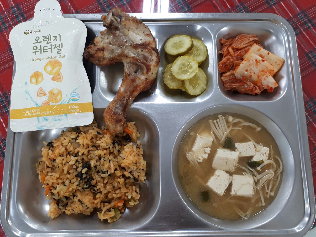 3일 중식 : 짬뽕볶음밥, 팽이버섯미소국, 로스트치킨, 오이피클, 배추김치, 워터젤리
