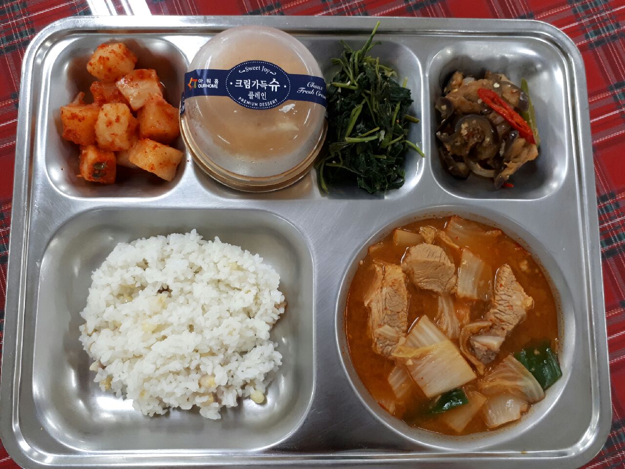 4일 중식 : 찰옥수수밥, 돈육우거지갈비탕, 취나물된장무침, 가지양파볶음, 깍두기, 슈플레인비올레뜨