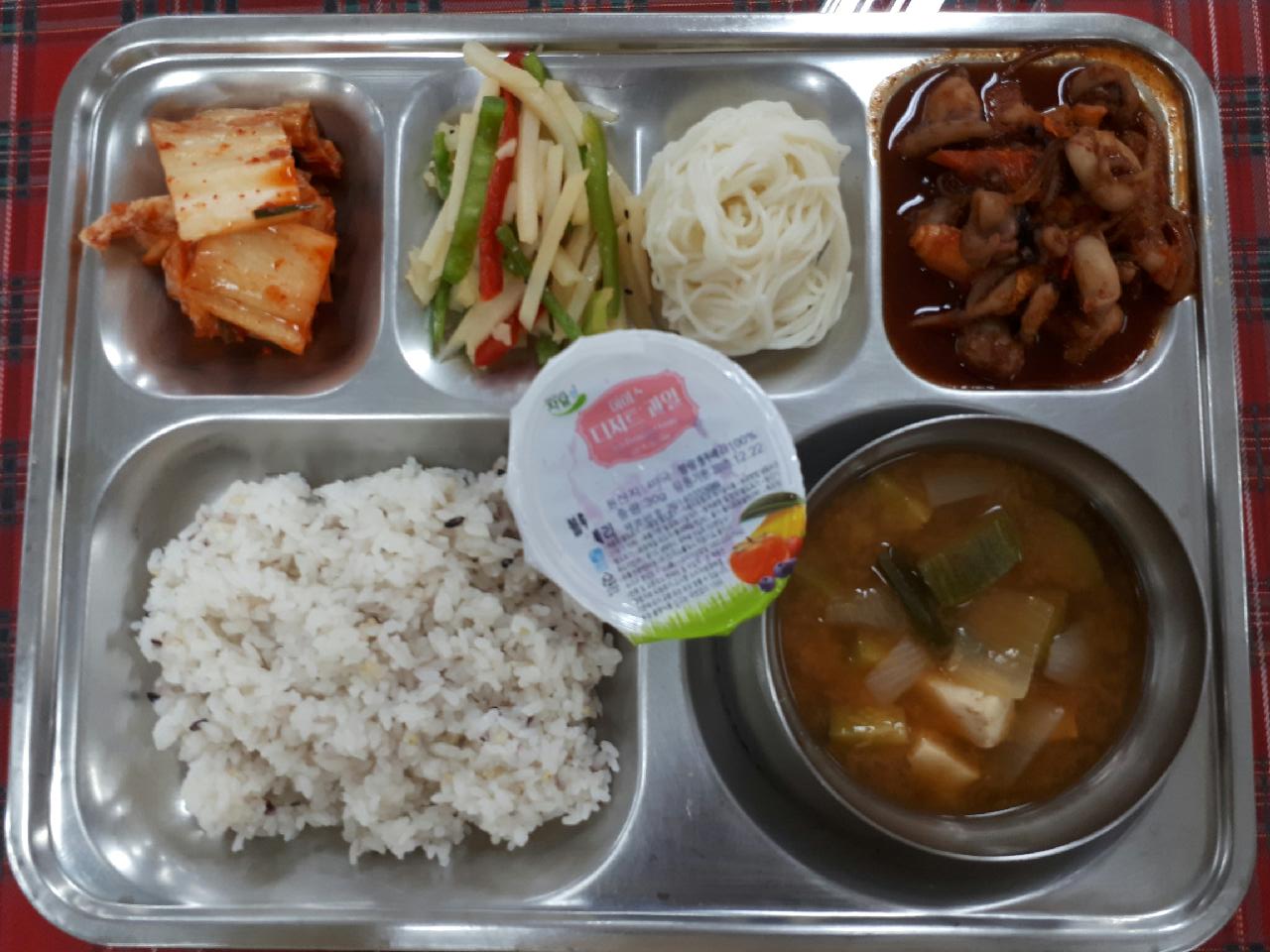 26일 중식 : 혼합잡곡밥, 호박두부된장국, 주꾸미볶음과 소면, 감자채피망볶음, 배추김치, 아이스블루베리