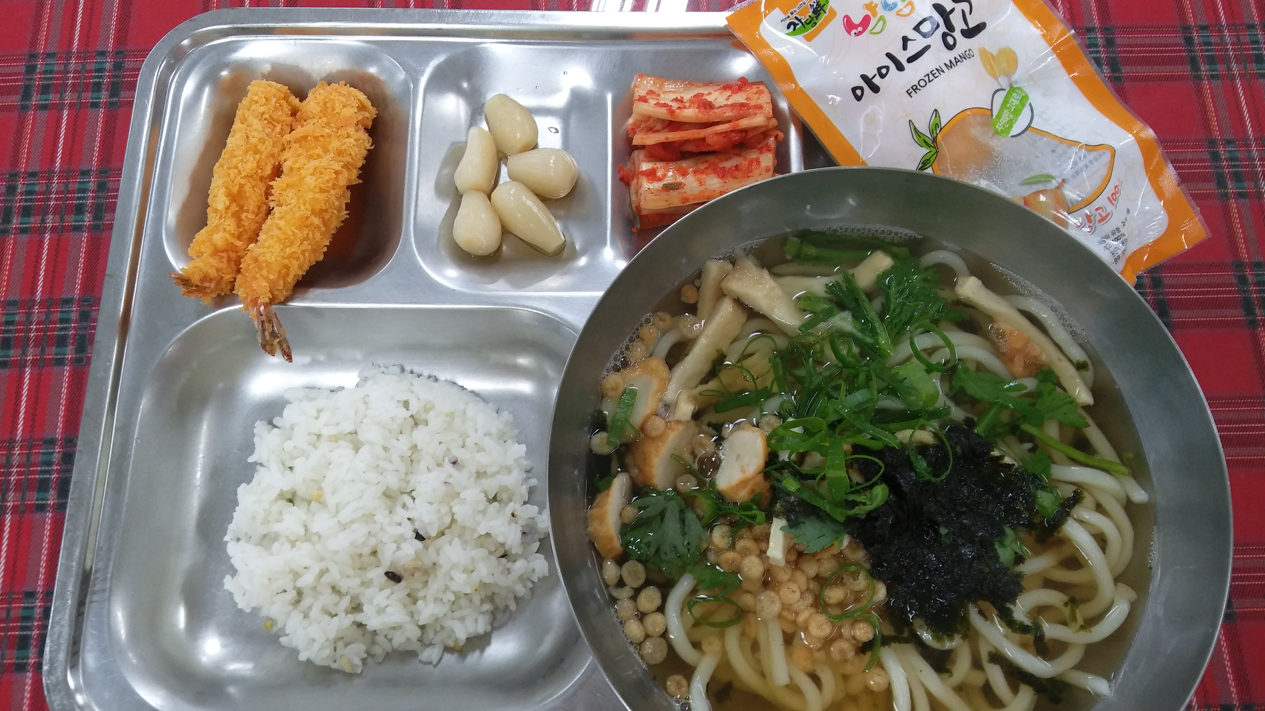 8일 중식 : 흰밥, 튀김우동, 왕새우튀김, 락교, 배추김치, 아이스망고