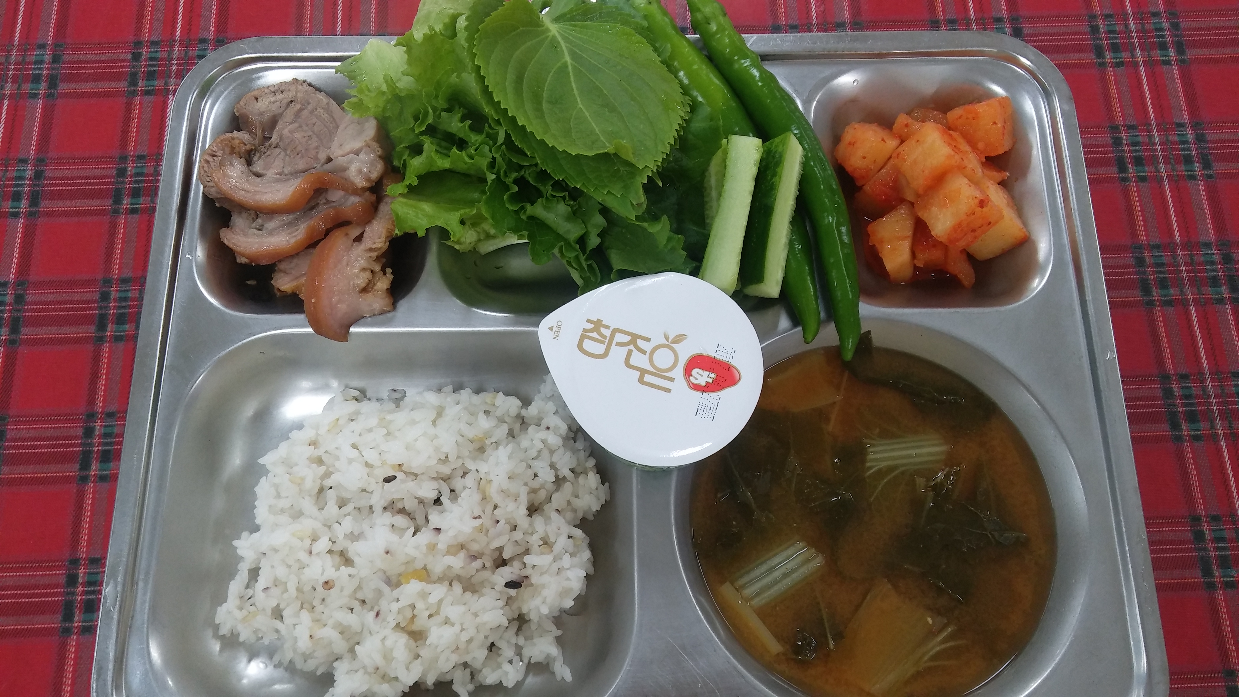 9일 중식 : 혼합잡곡밥, 배추된장국, 오향장육, 상추야채스틱/쌈장, 깍두기, 청포도소르베