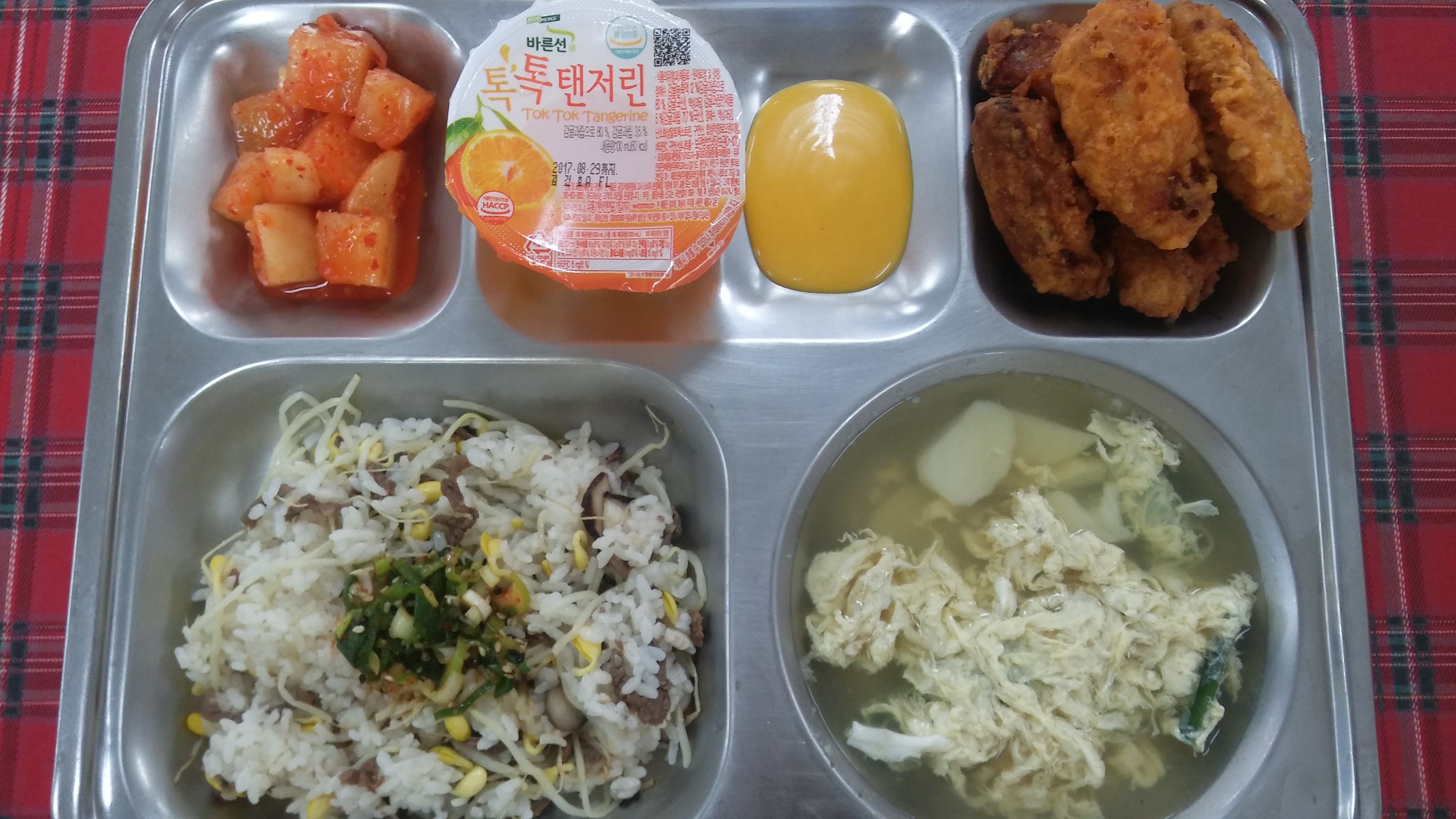 13일 중식 : 소고기콩나물밥/양념장, 감자계란국, 치킨윙/머스터드, 깍두기, 톡톡텐저린