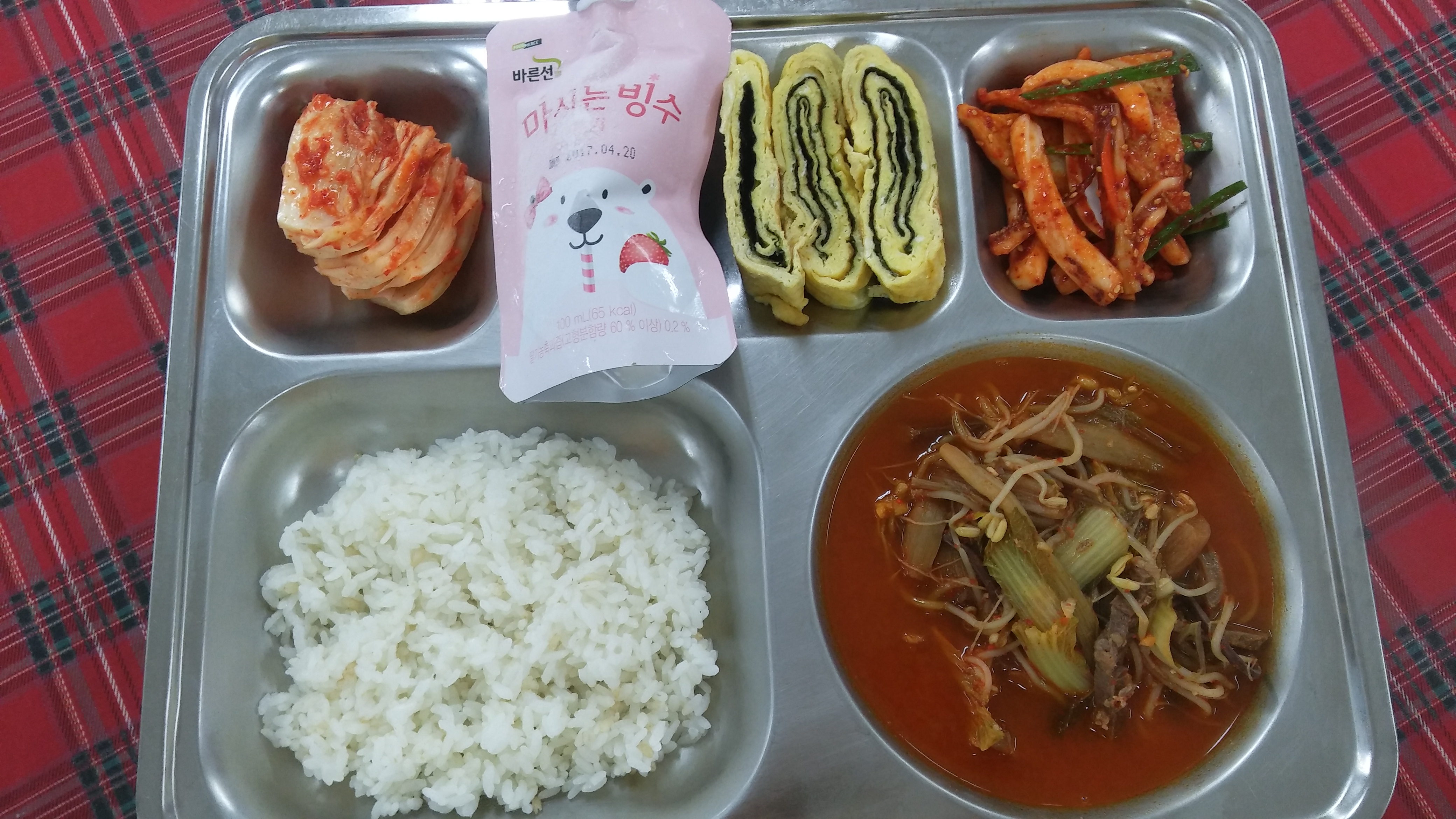 1일 중식 : 발아현미밥, 육개장, 김계란말이, 어묵오징어무침, 배추김치, 마시는딸기빙수