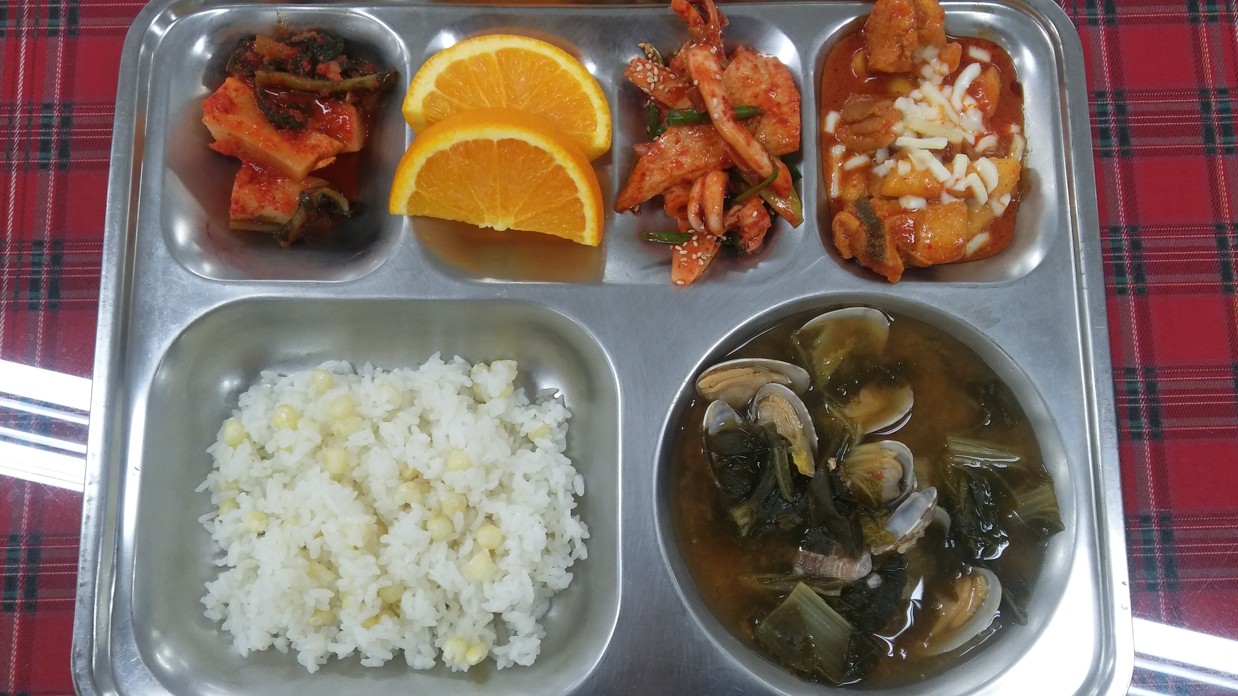 16일 중식 : 옥수수밥, 바지락배추된장국, 치즈불닭, 어묵오징어무침, 총각김치, 오렌지