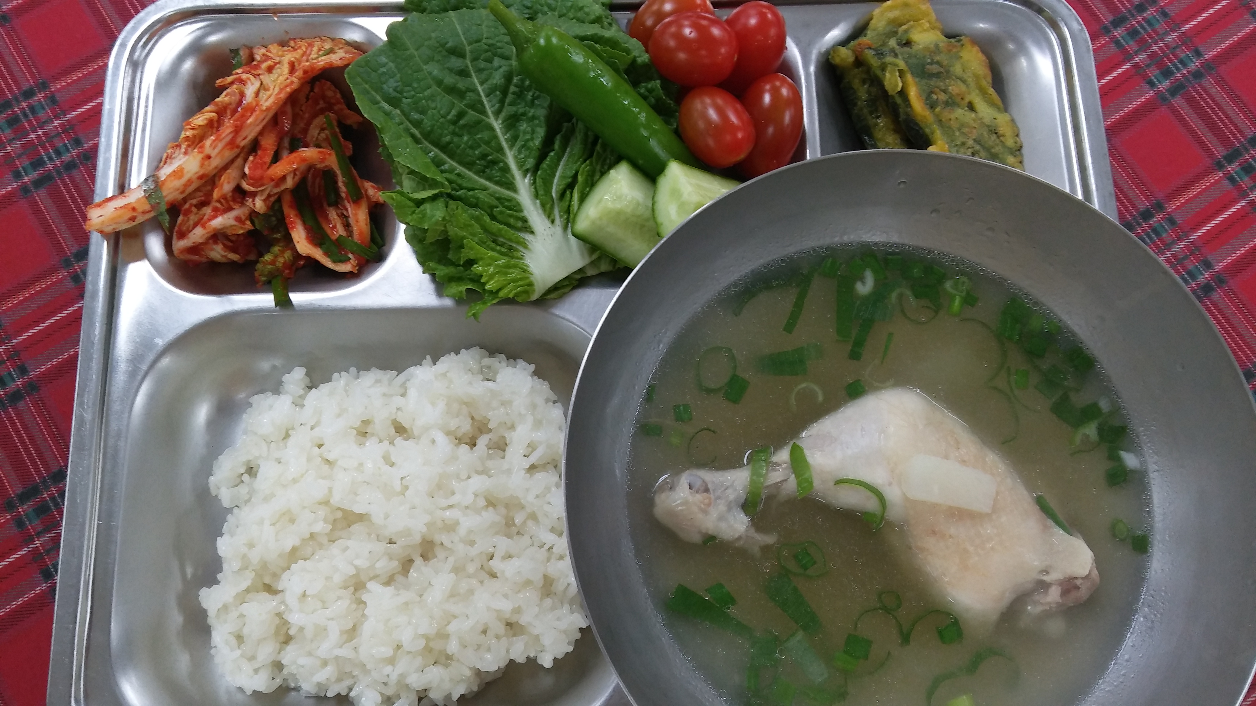 17일 중식 : 찰밥, 장각삼계탕, 야채스틱/고추장, 깻잎전, 배추겉절이, 방울토마토