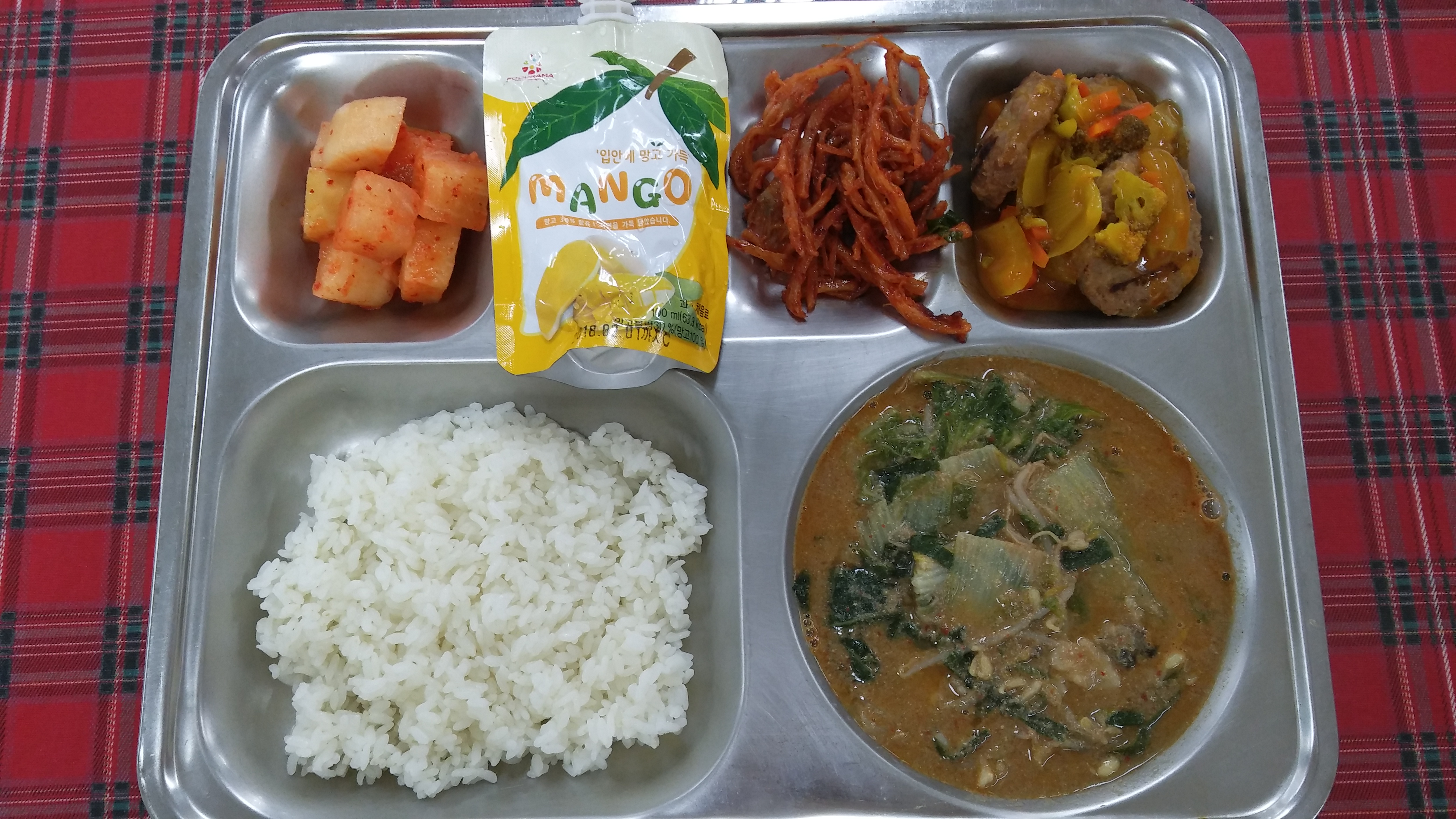 29일 중식 : 차조밥, 추어탕, 치킨스테이크/토마토커리소스, 오징어채볶음, 깍두기, 망고쥬스