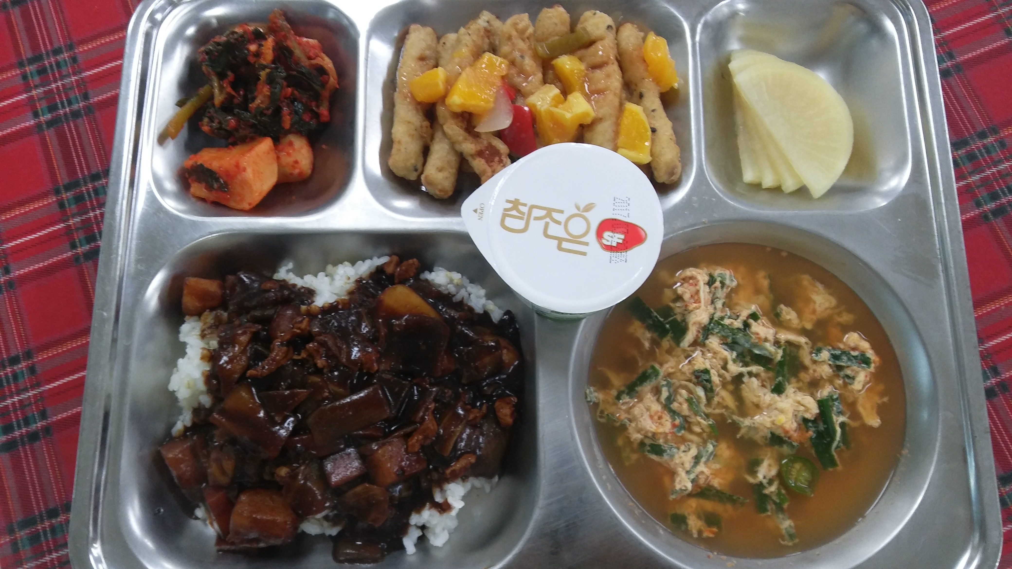 11일 중식 : 흰밥, 짜장소스, 매운부추계란국물, 오렌지탕수육, 백색단무지, 총각김치, 청포도소르베
