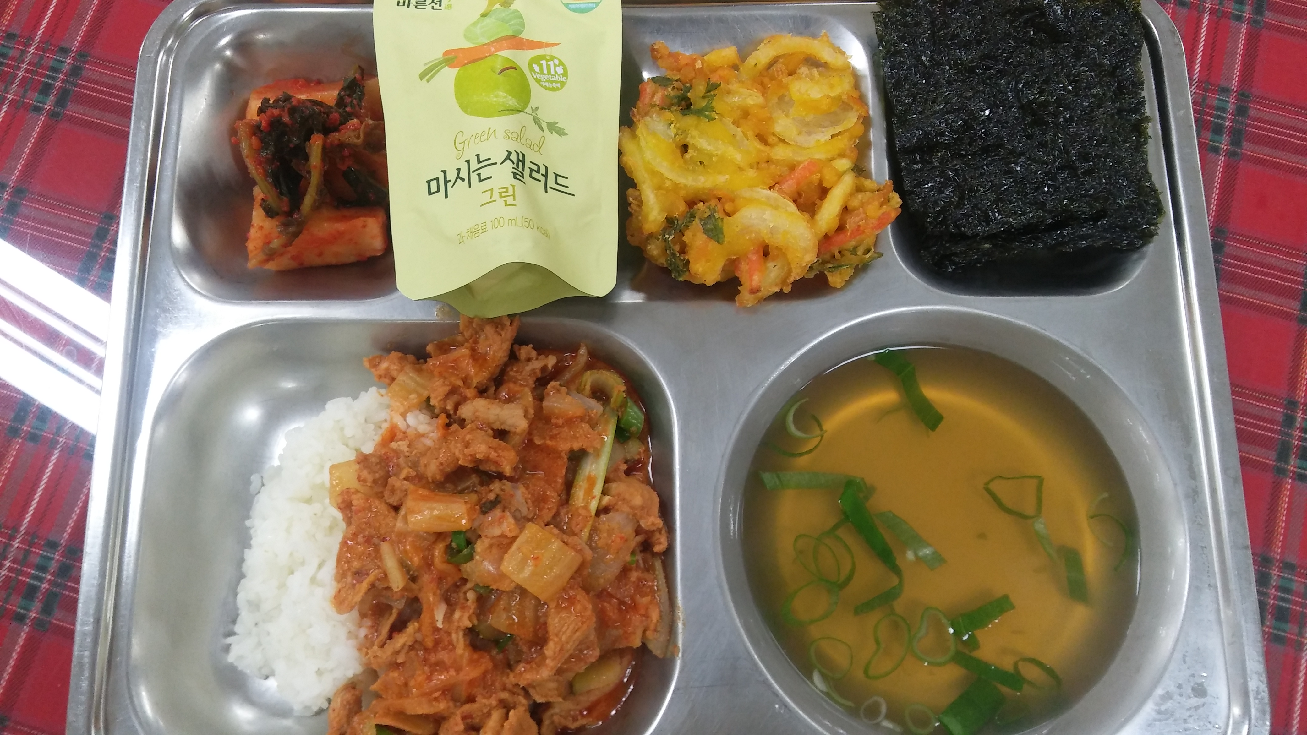 12일 중식 : 돈육김치덮밥, 우동국물, 구이김, 총각김치, 야채튀김, 마시는 샐러드