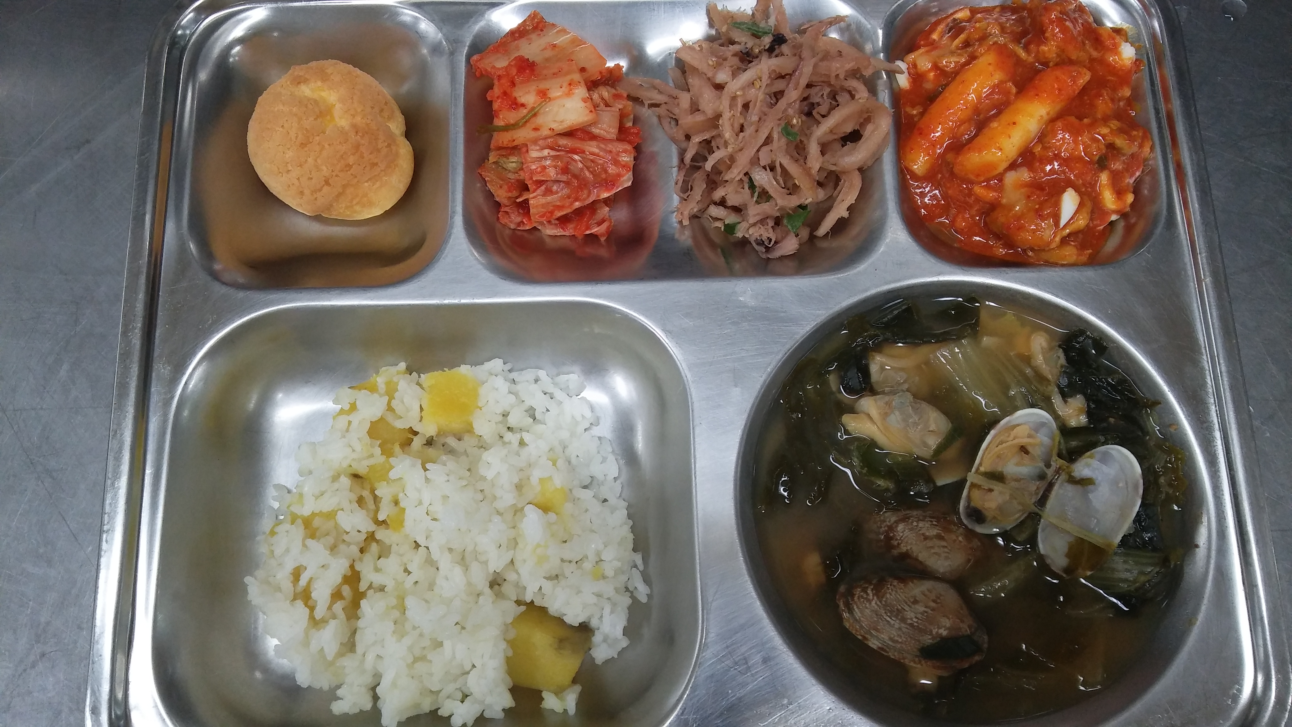 20일 중식 : 고구마밥, 바지락배추된장국, 치즈불닭, 진미채간장조림, 배추김치, 생크림아이스슈