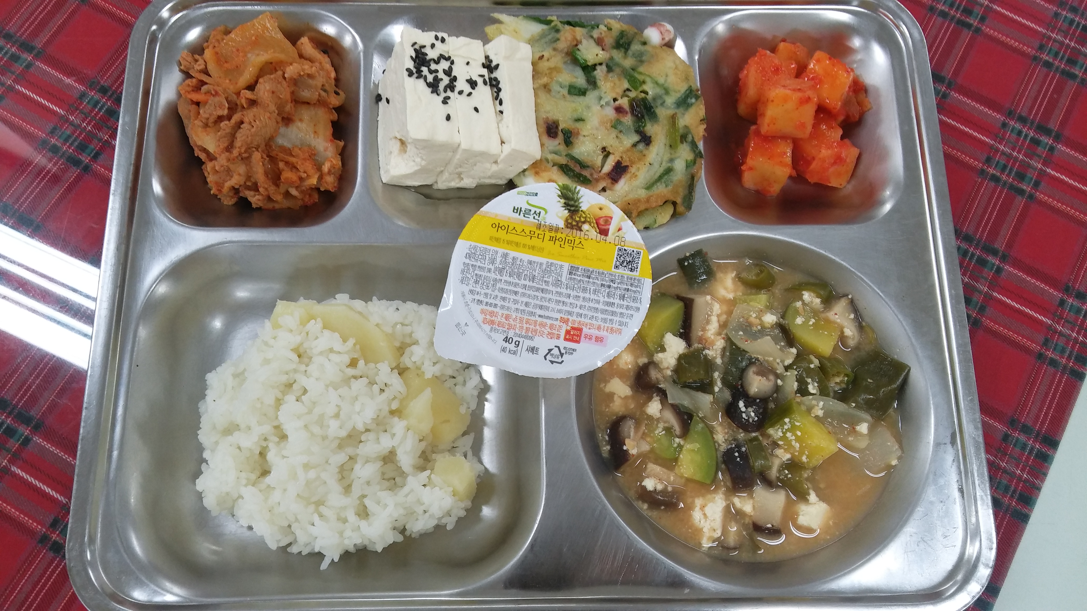 5일 중식 : 감자밥, 강된장찌개, 김육김치볶음/온두부, 해물부추전, 깍두기, 아이스파인스무디