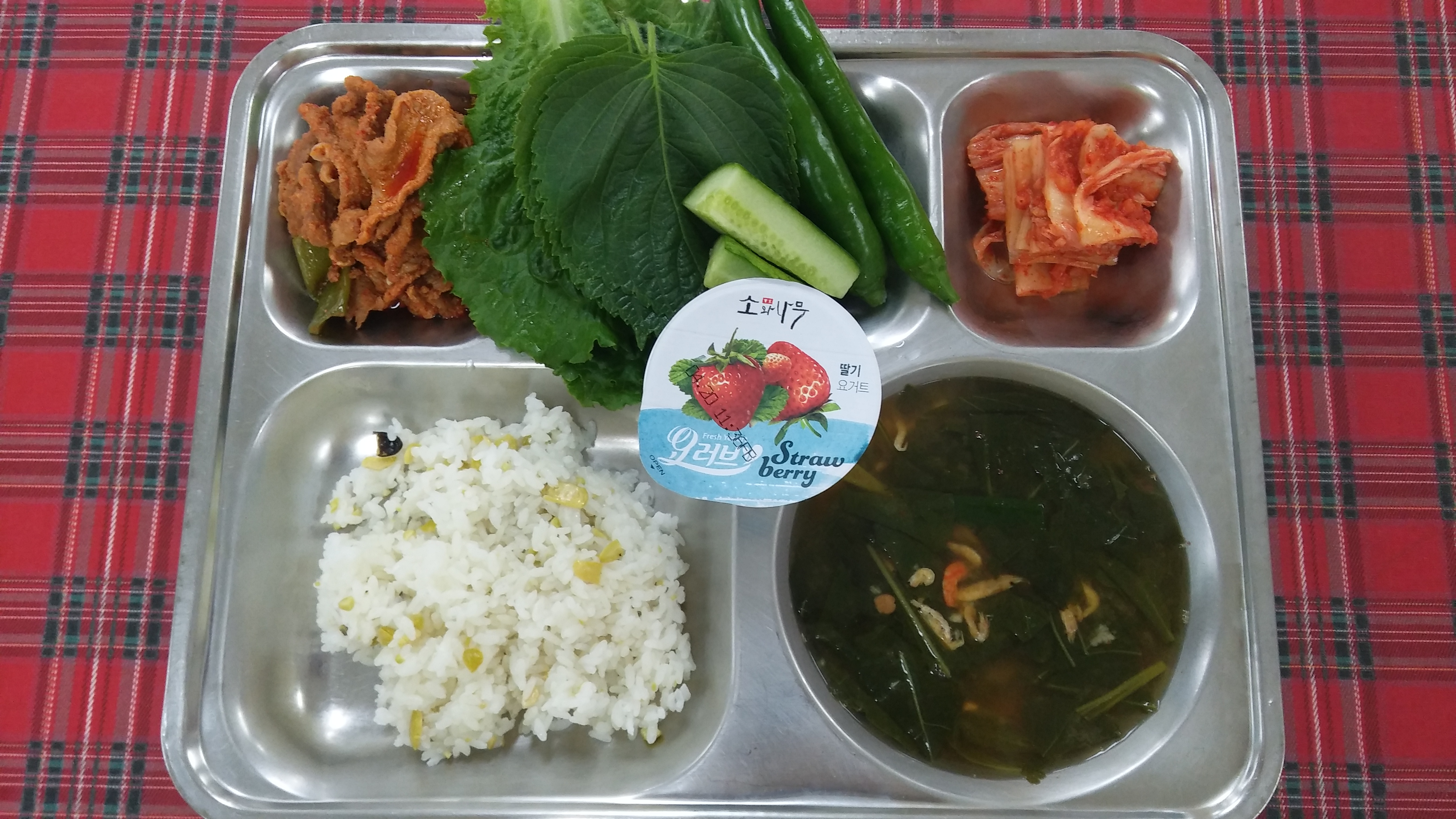 11일 중식 : 조각콩밥, 건새우아욱국, 상추야채스틱, 돼지고기고추장볶음, 배추김치, 요플레