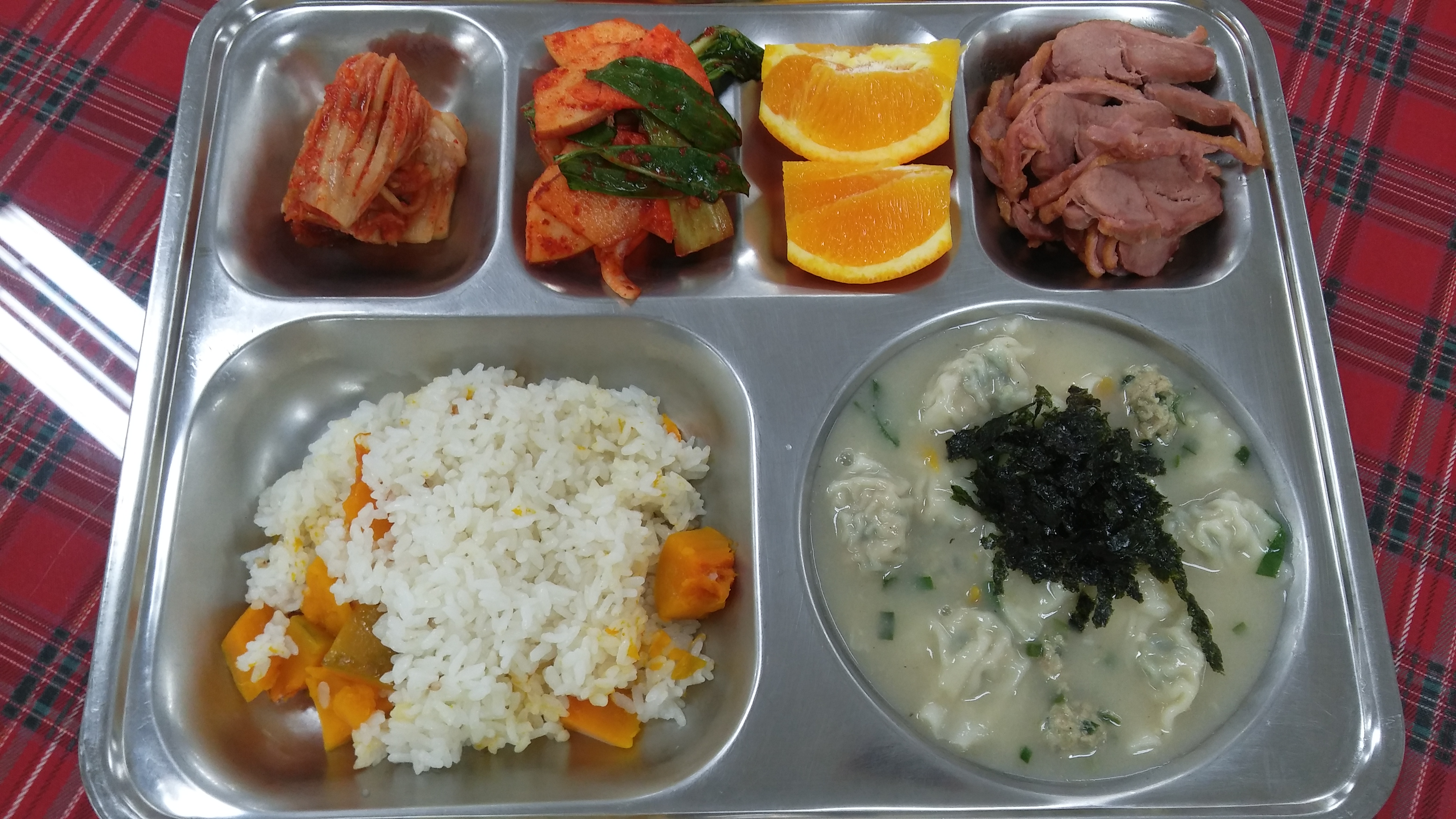 3일 중식 : 단호박밥, 물만두떡국, 오리훈제/머스타드, 청경채사과무침, 배추김치, 오렌지