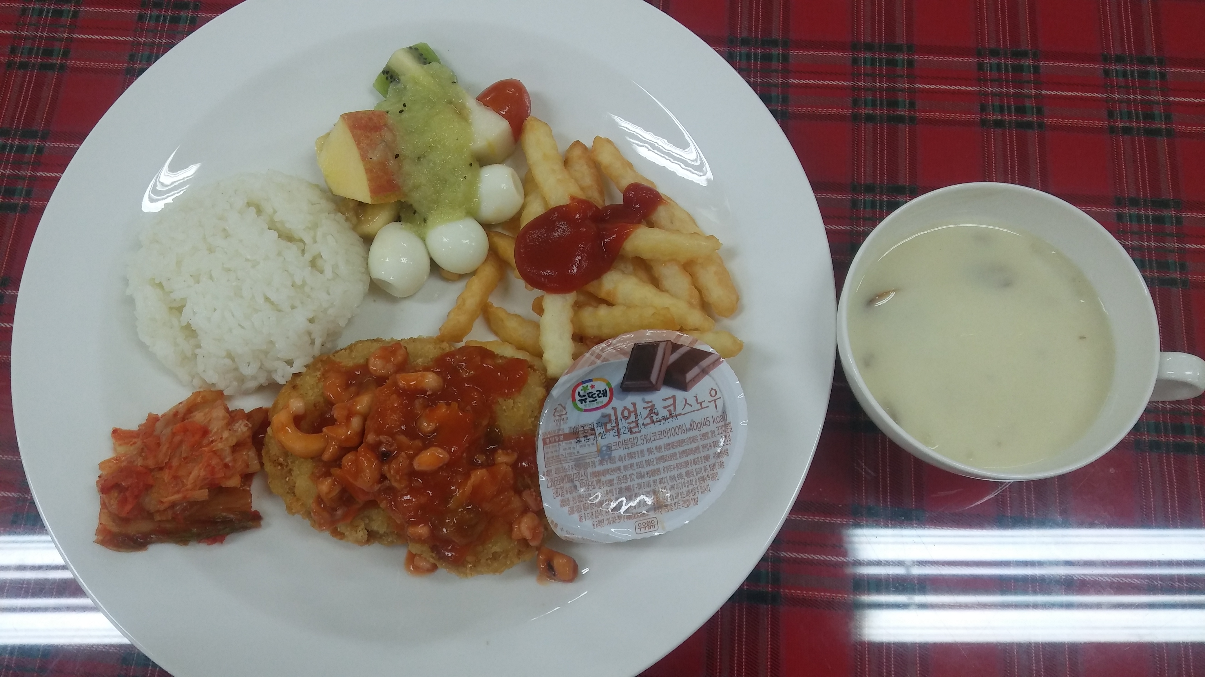15일 중식 : 흰밥, 양송이스프, 해물돈까스, 과일샐러드/키위소스, 감자튀김/케찹, 배추김치, 스무디