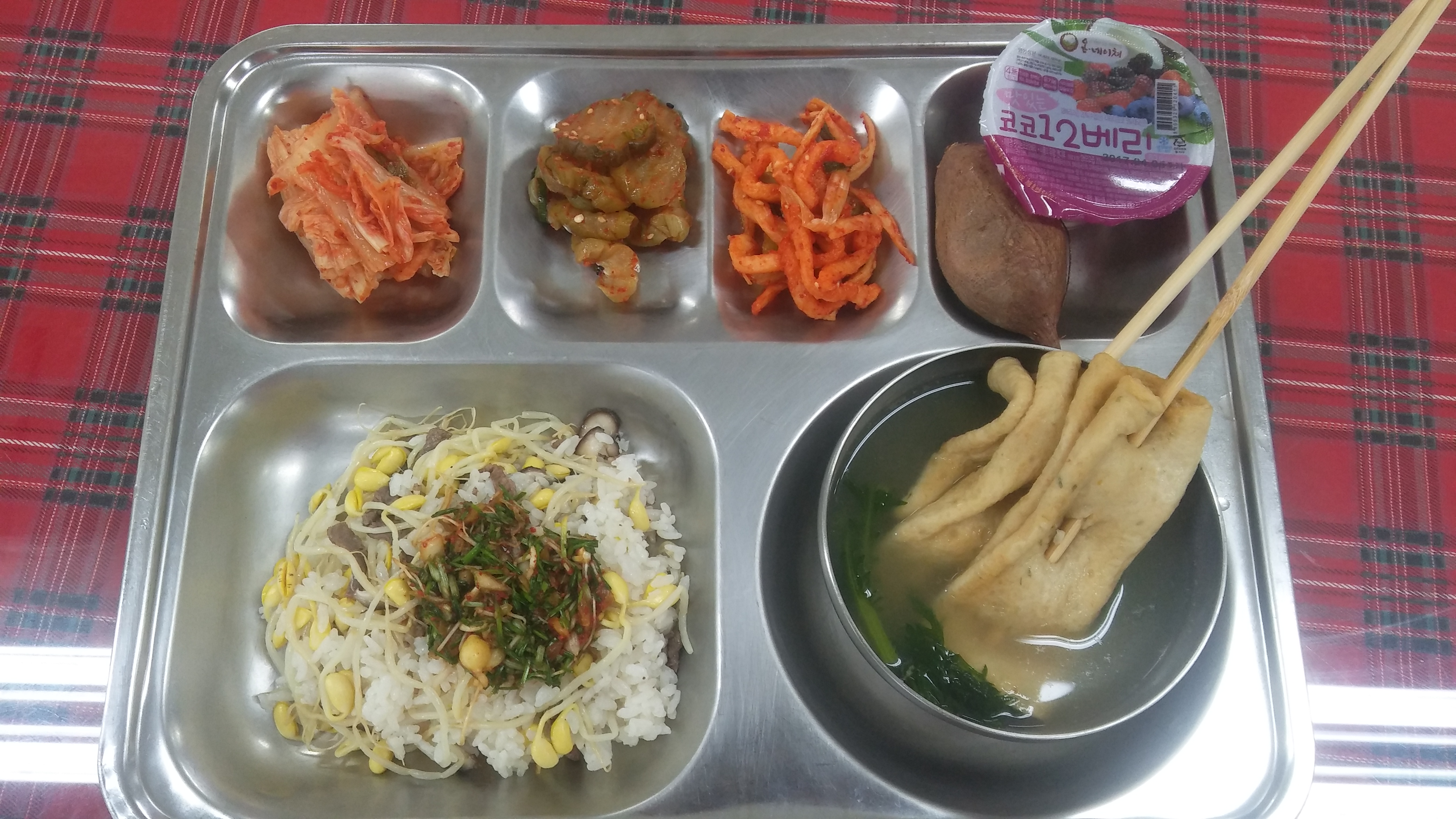 8일 중식 : 소고기콩나물밥/달래장, 꼬치어묵국, 무말랭이무침, 오이장아찌무침, 배추김치, 꿀고구마, 12베리쥬스