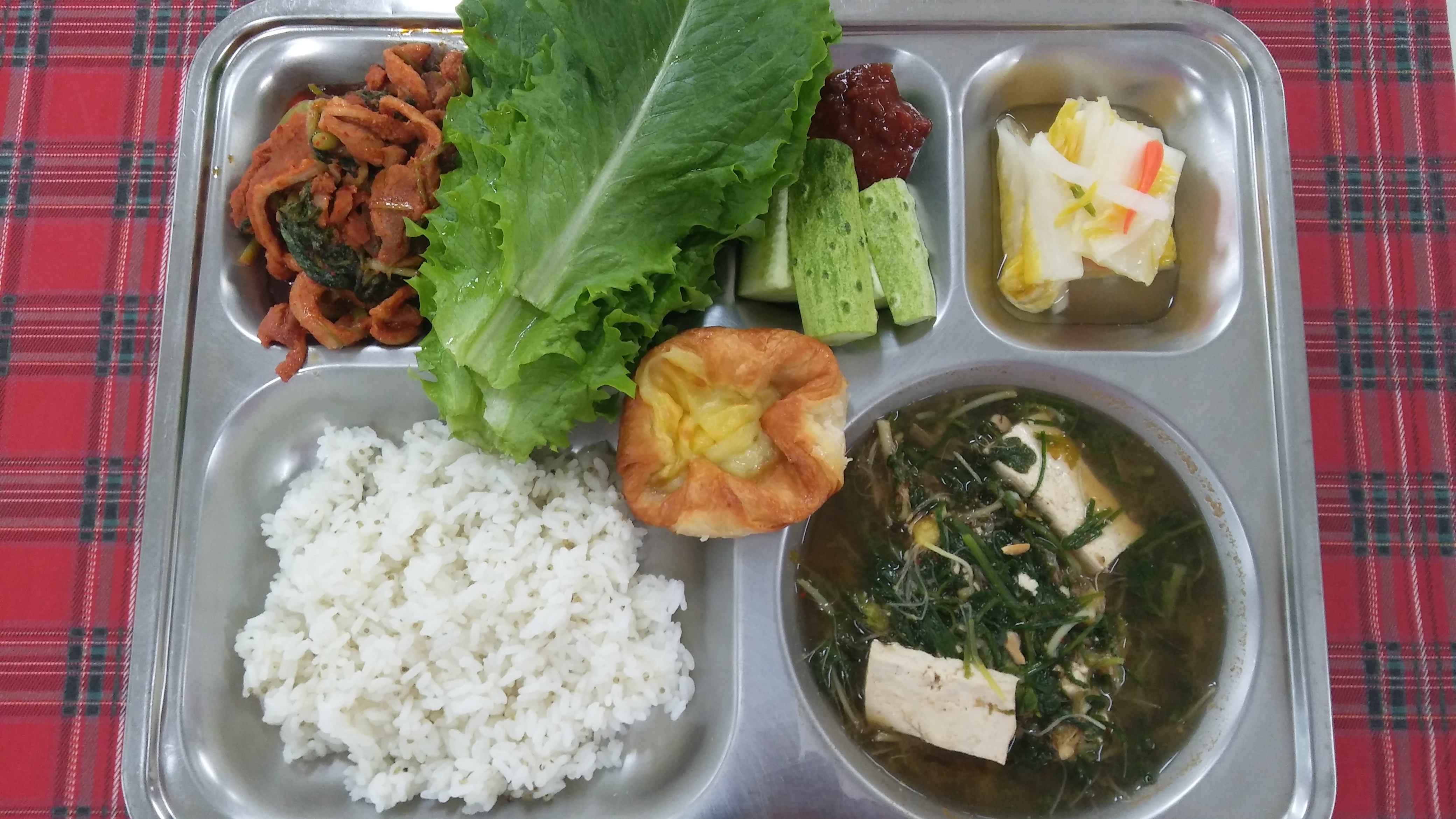 9일 중식 : 차조밥, 달래냉이된장국, 오리불고기, 친환경야채쌈/쌈장, 백김치, 바닐라크라운패스트리