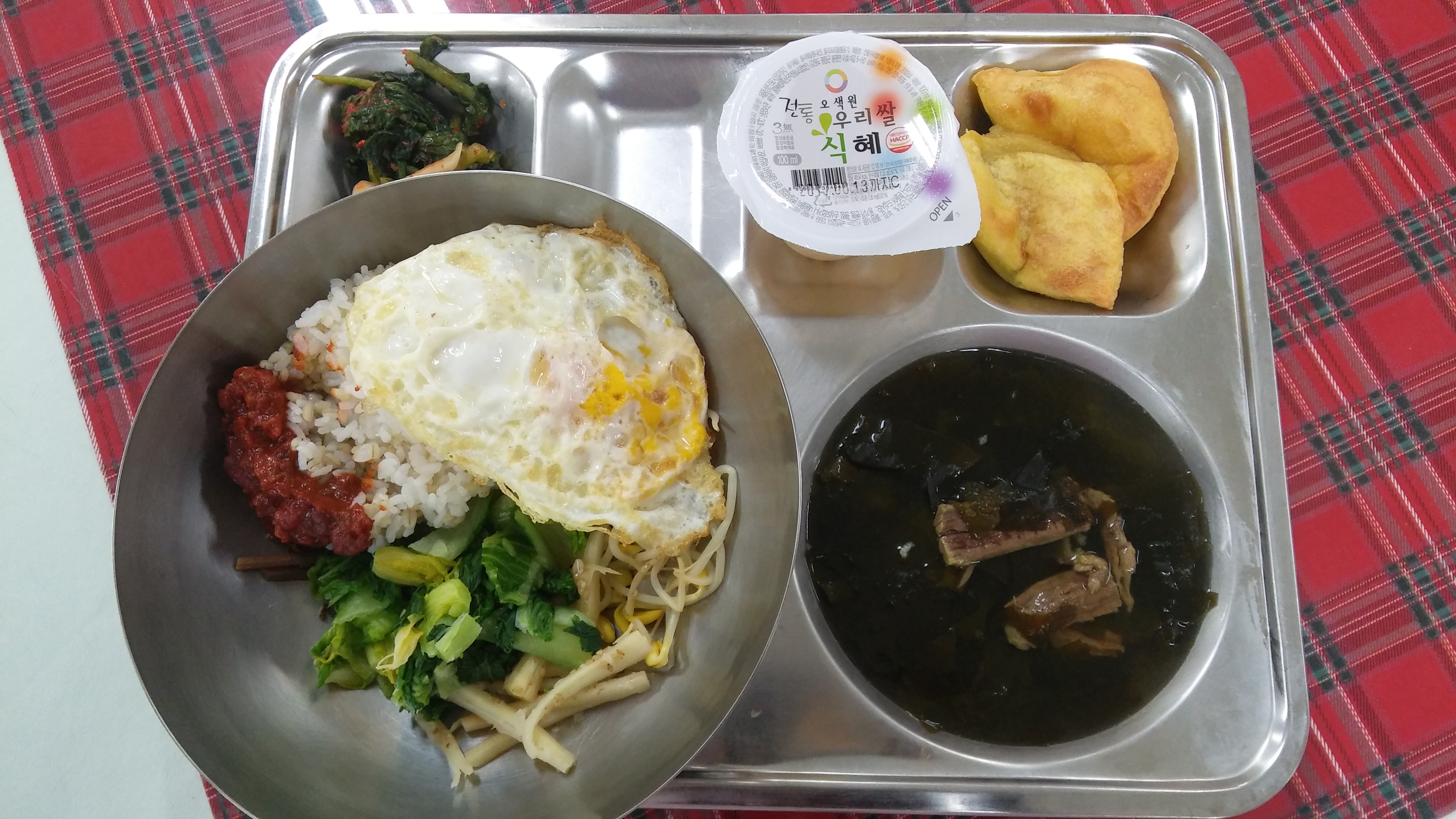 10일 중식 : 나물비빔밥/볶음고추장, 소고기미역국, 계란후라이, 열무김치, 단호박부꾸미, 식혜