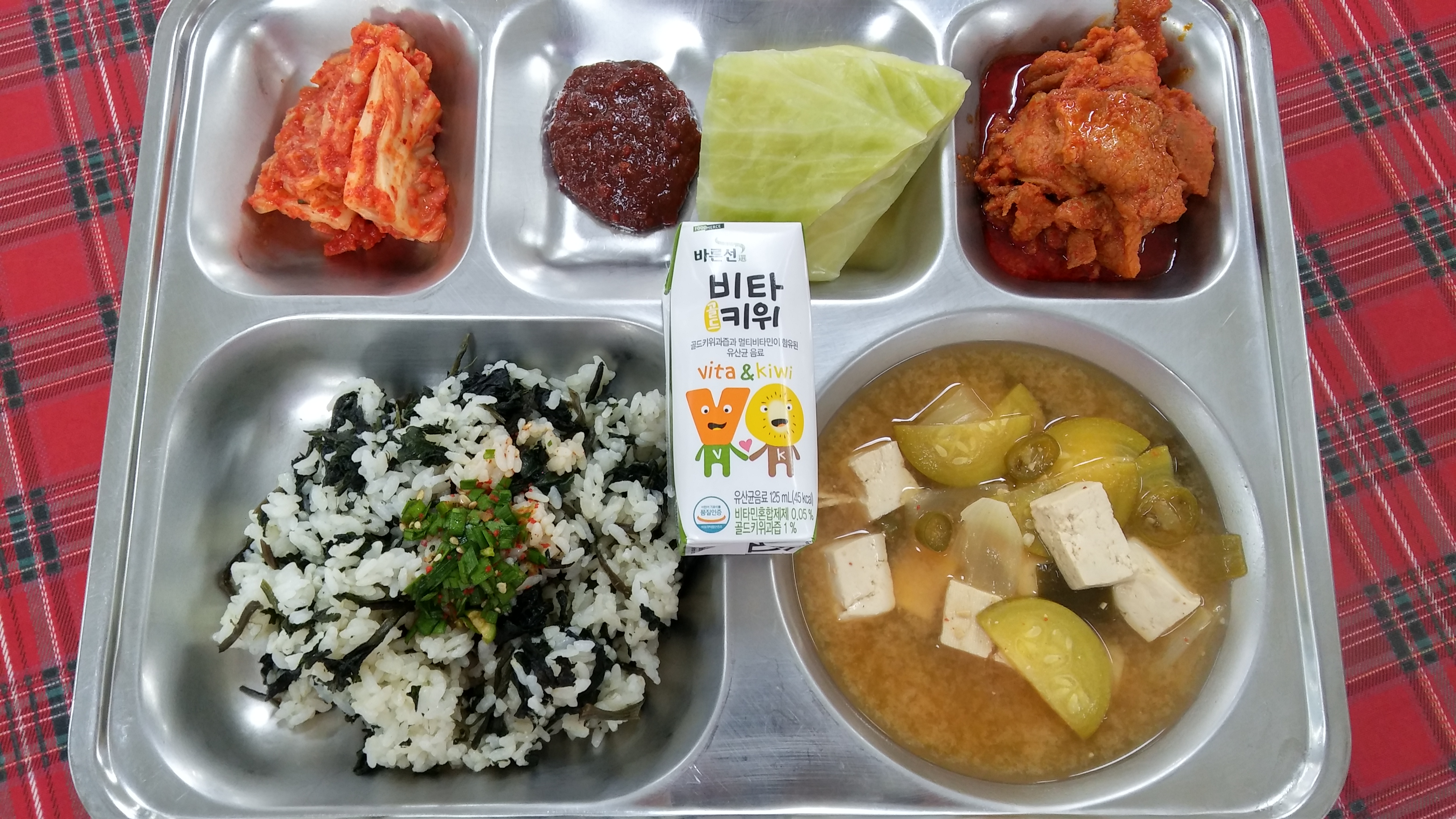 2일 중식 : 곤드레밥/양념장, 돼지불고기, 호박두부된장국, 양배추쌈/쌈장, 깍두기, 비타키위쥬스