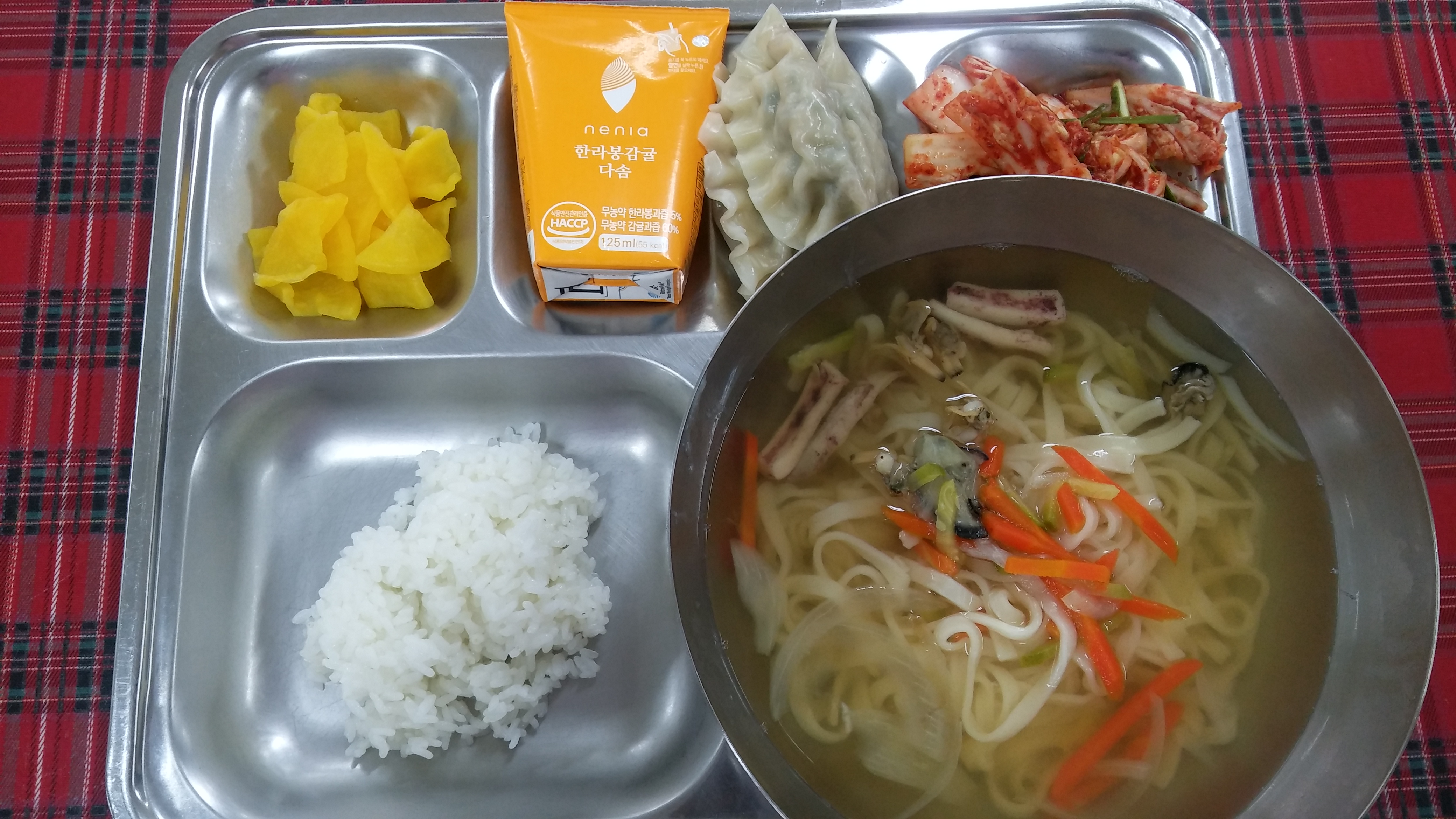 9일 중식 : 흰밥, 해물칼국수, 왕교자만두, 배추겉절이, 꼬들단무지, 한라봉감귤쥬스