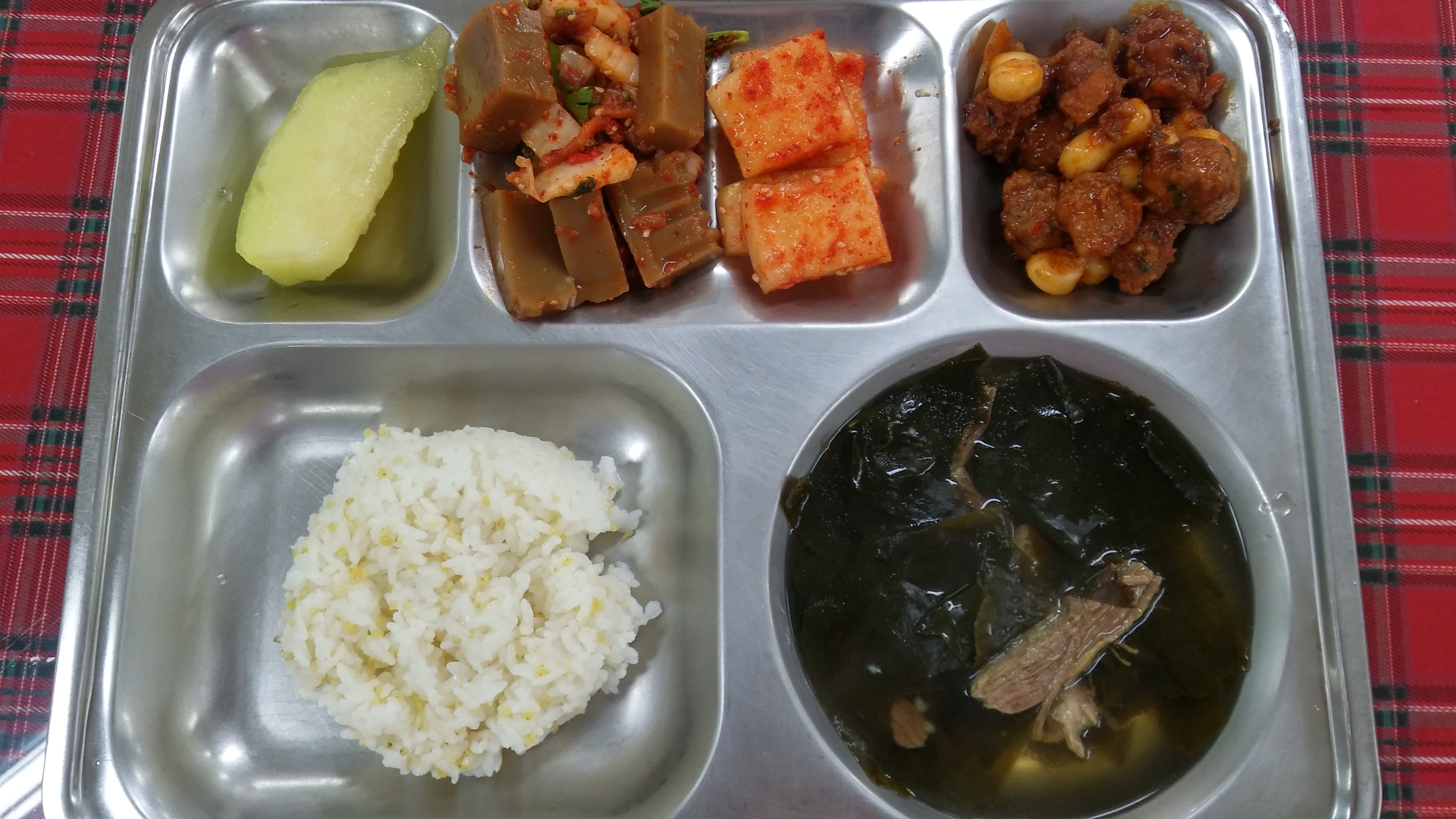22일 중식 : 혼합10곡밥, 소고기미역국, 삼채미트볼케찹볶음, 도토리묵김치무침, 깍두기, 메론