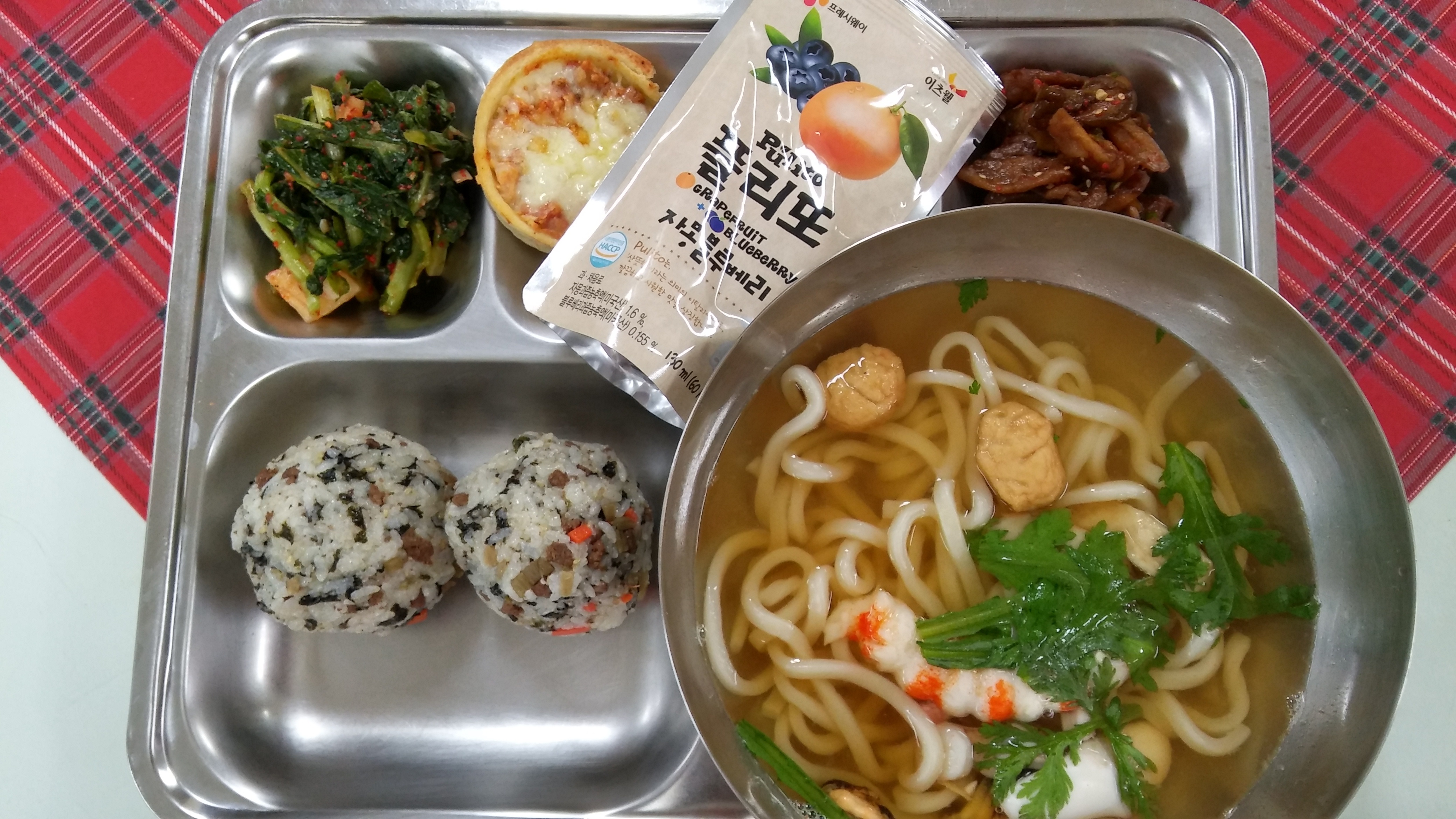 30일 중식 : 소고기주먹밥, 해물우동, 오복채무침, 배추김치, 빠네, 플리또자몽블루베리