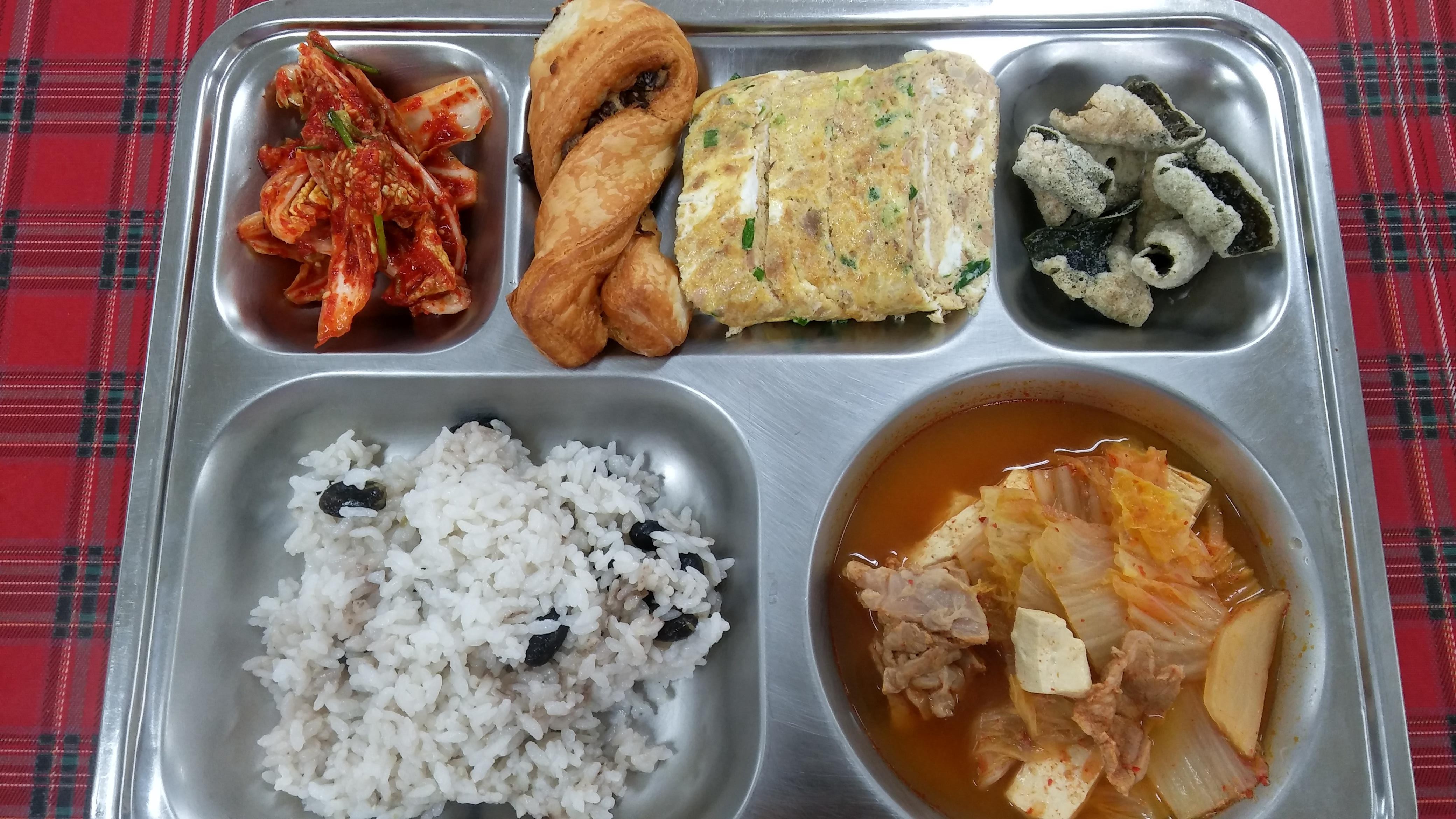 10일 중식 : 강낭콩밥, 사태김치찌개, 참치계란말이, 다시마부각, 겉절이, 초코칩패스트리