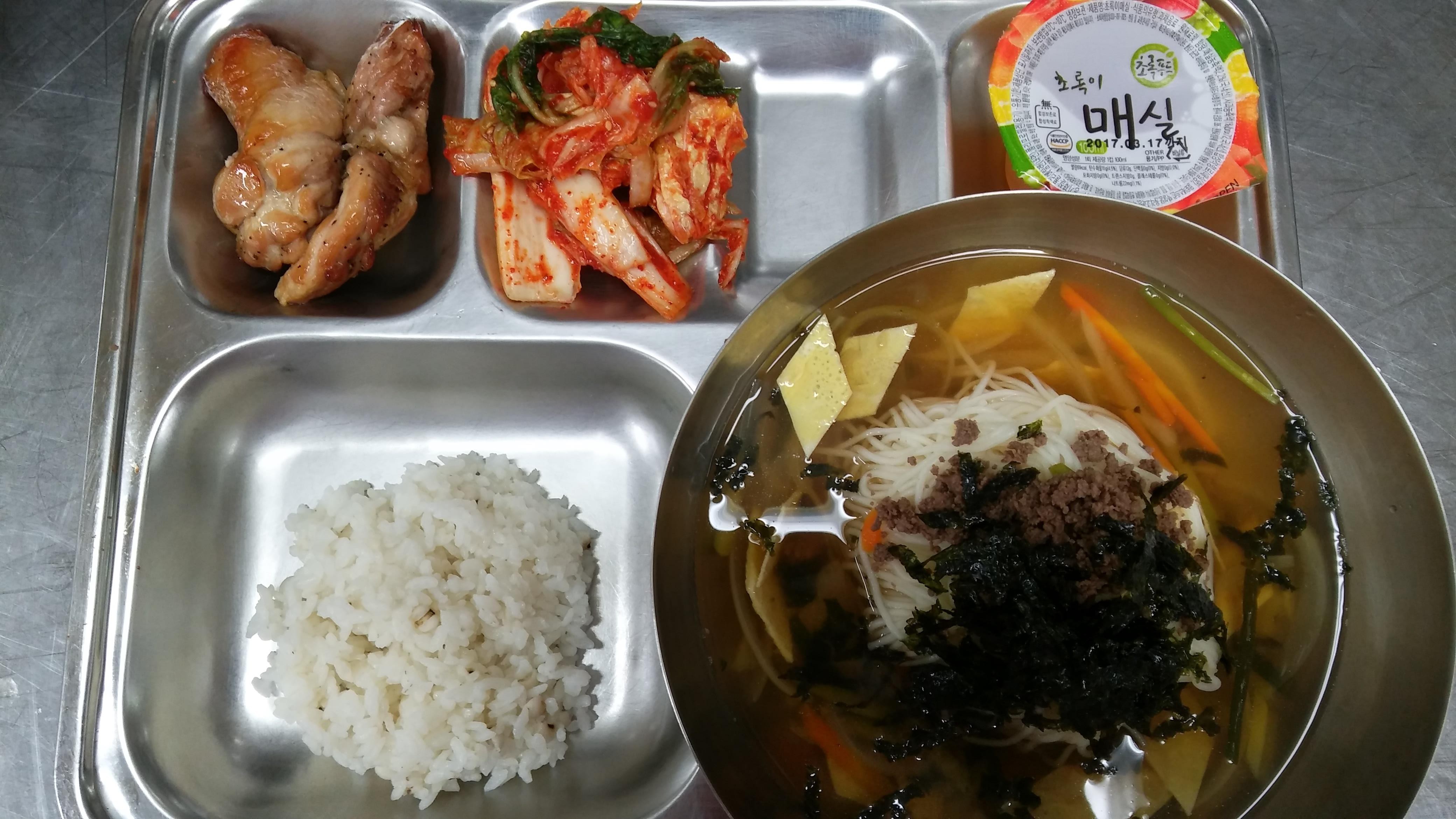 16일 중식 : 흰밥, 잔치국수, 간장양념치킨, 배추김치, 매실쥬스