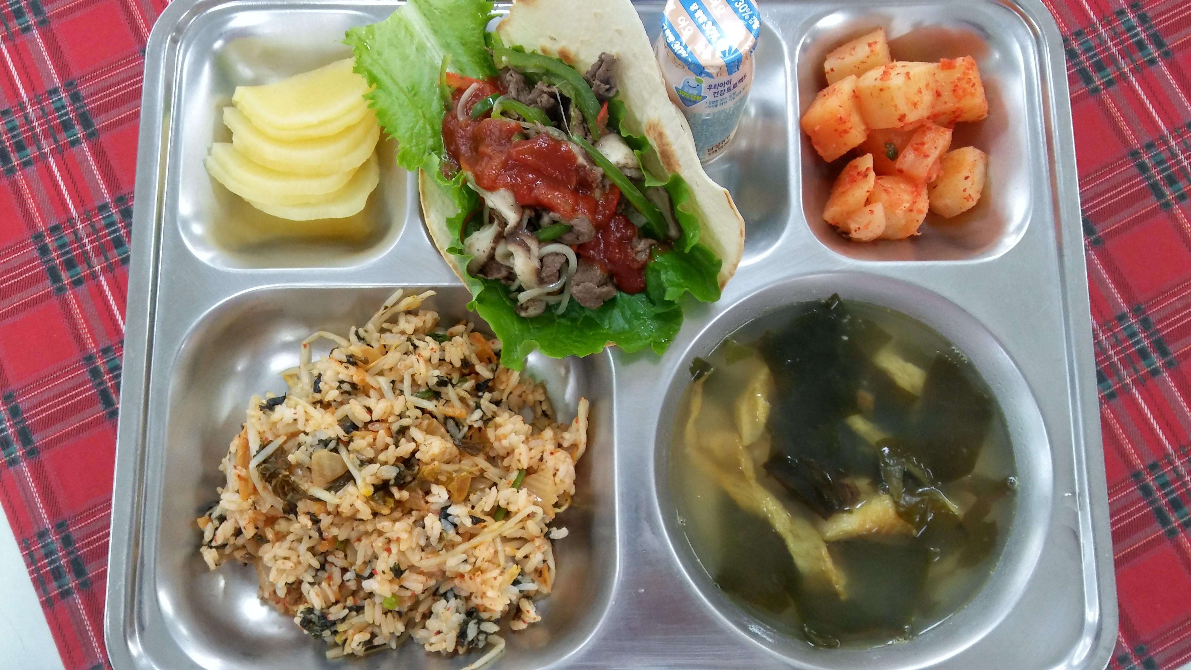 4일 중식 : 콩나물김치볶음밥, 황태미역국, 불고기또띠아, 백색단무지, 깍두기, 이오