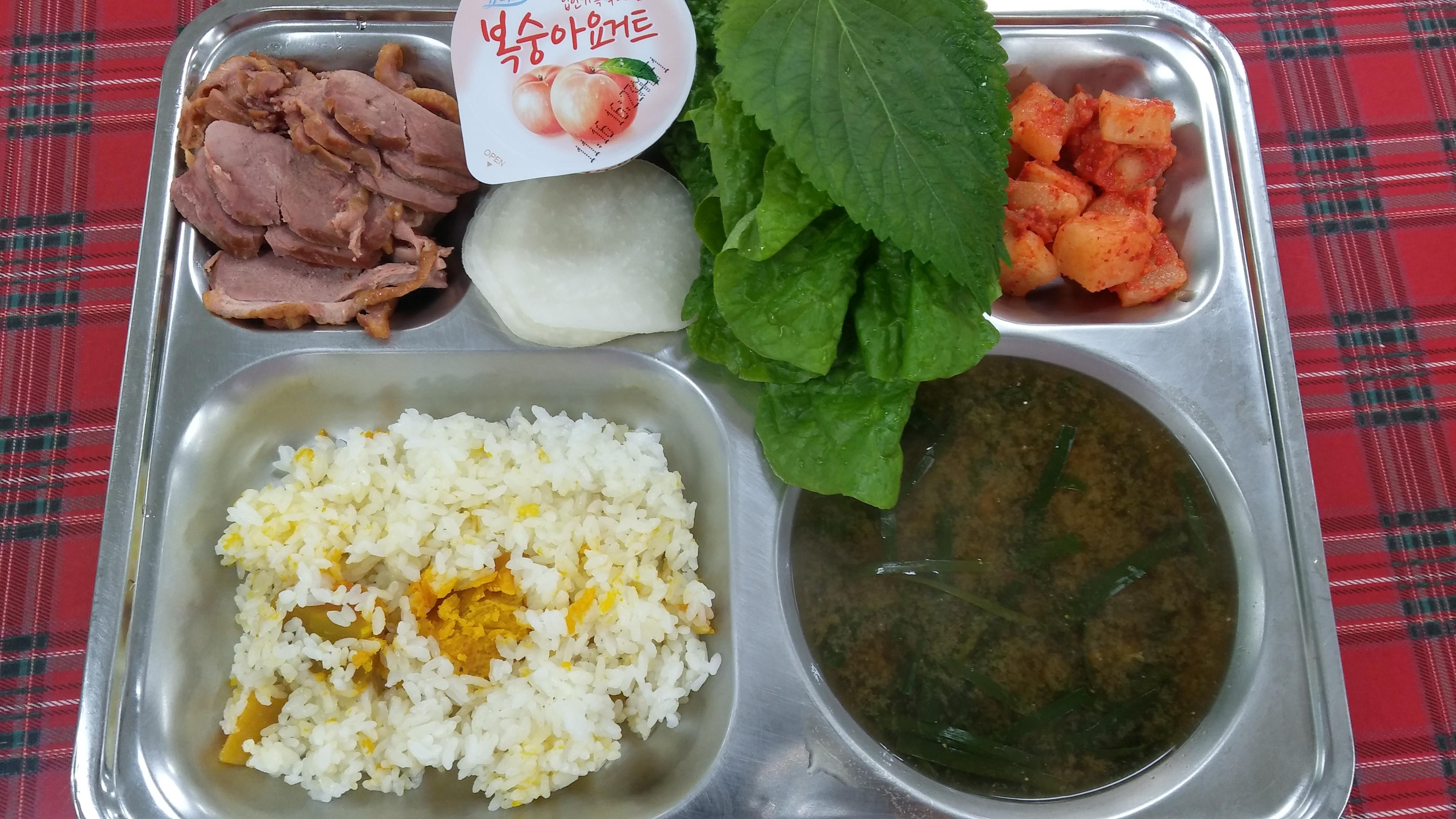7일 : 단호박밥, 부추올갱이국, 오리훈제/머스타드, 상추,깻잎/쌈장, 와인무쌈, 배추김치, 요러브복숭아