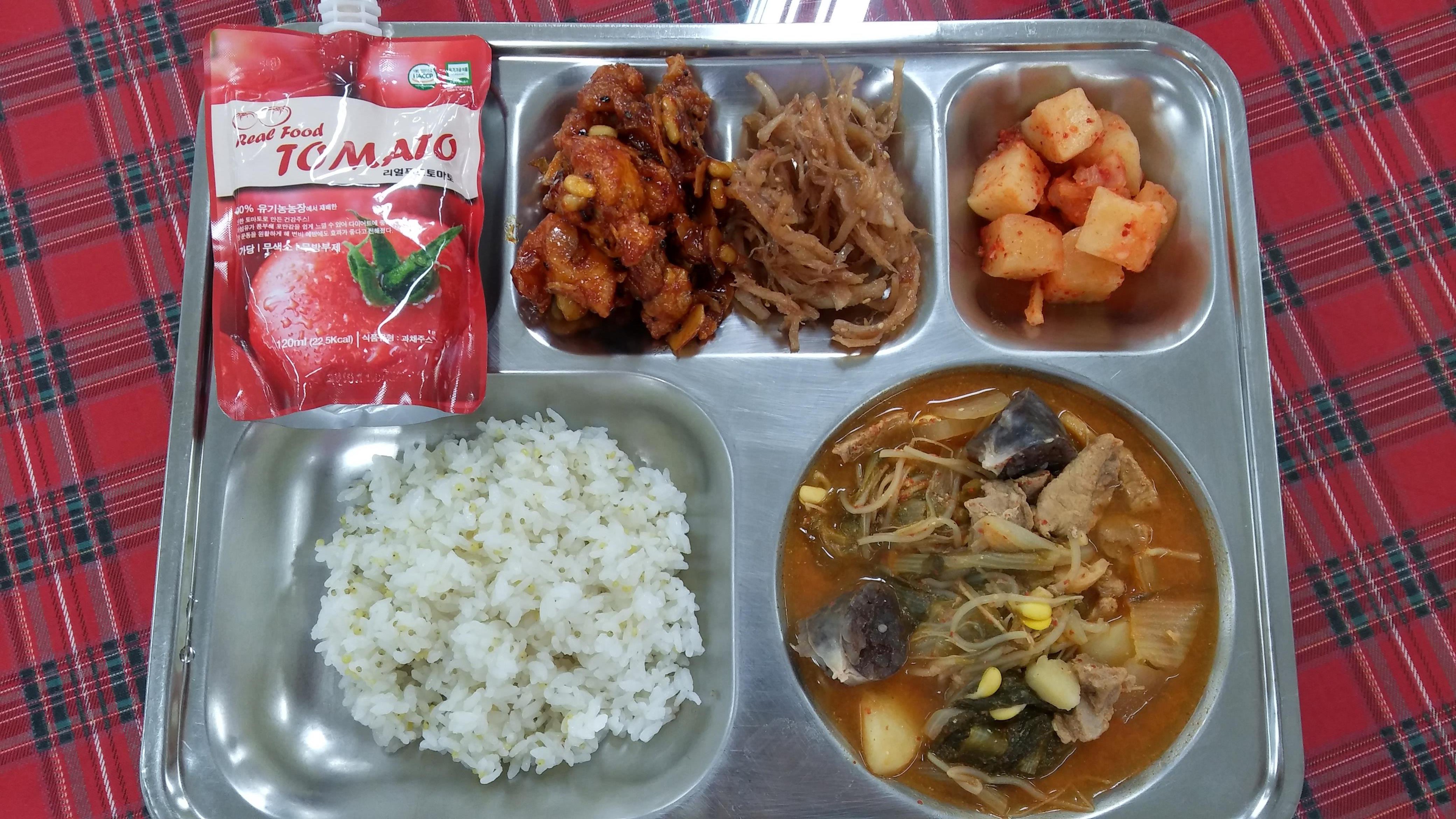 8일 중식 : 혼합잡곡밥, 순대국, 견과류순살닭강정, 진미채무침, 깍두기, 토마토쥬스