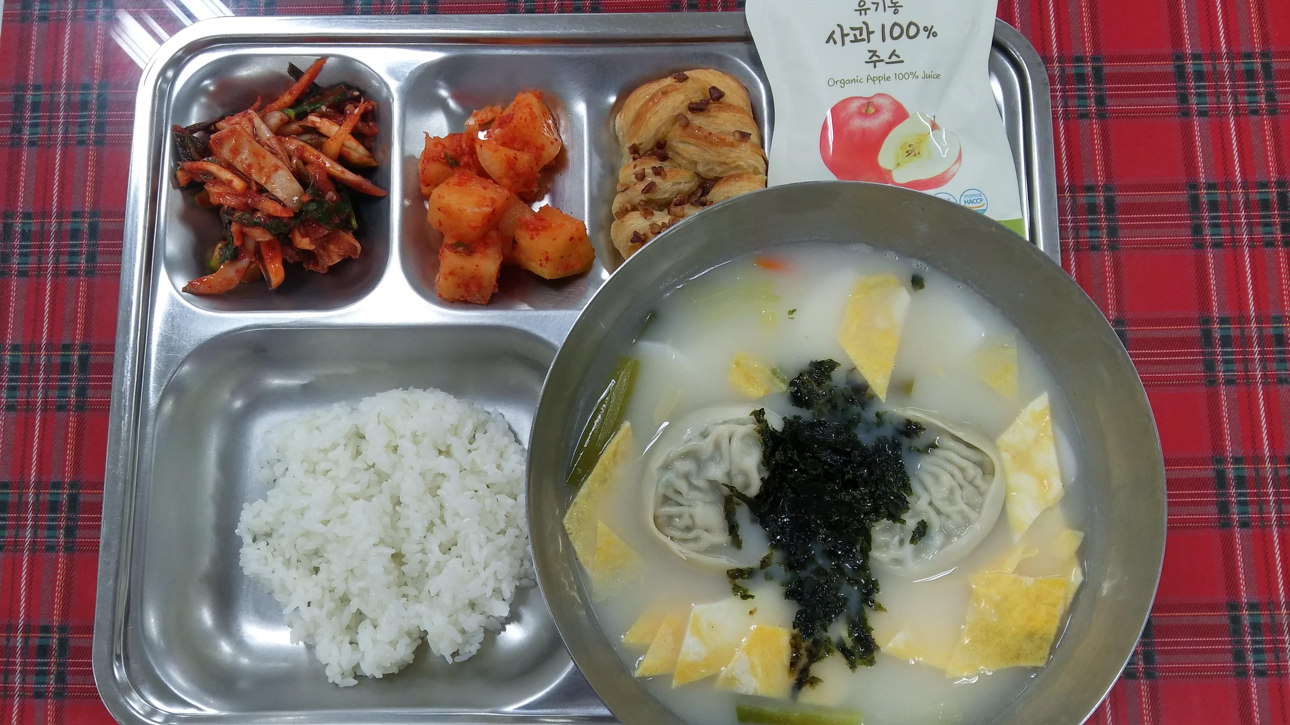 21일 중식 : 흰밥, 사골떡왕만두국, 오징어숙회무침, 깍두기, 미니메이플피칸파이, 사과쥬스