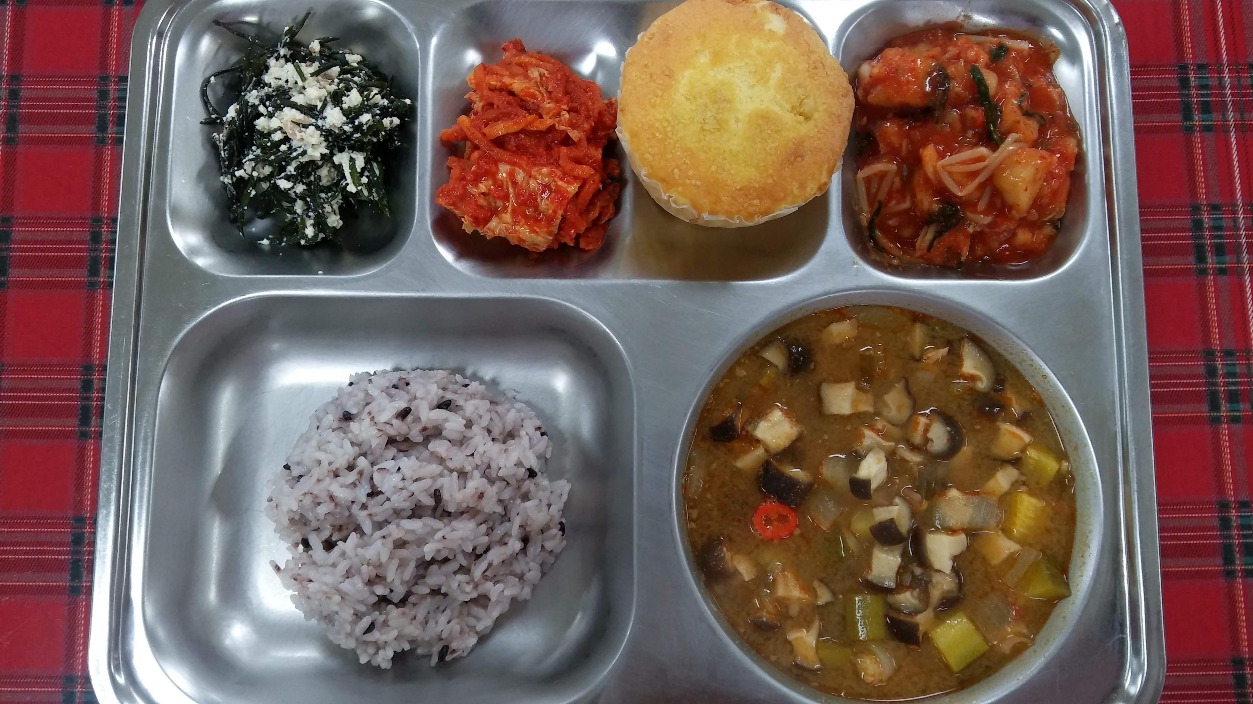 24일 중식 : 흑미밥, 강된장찌개, 대구살콩나물찜, 톳두부무침, 배추김치, 쉬폰케익