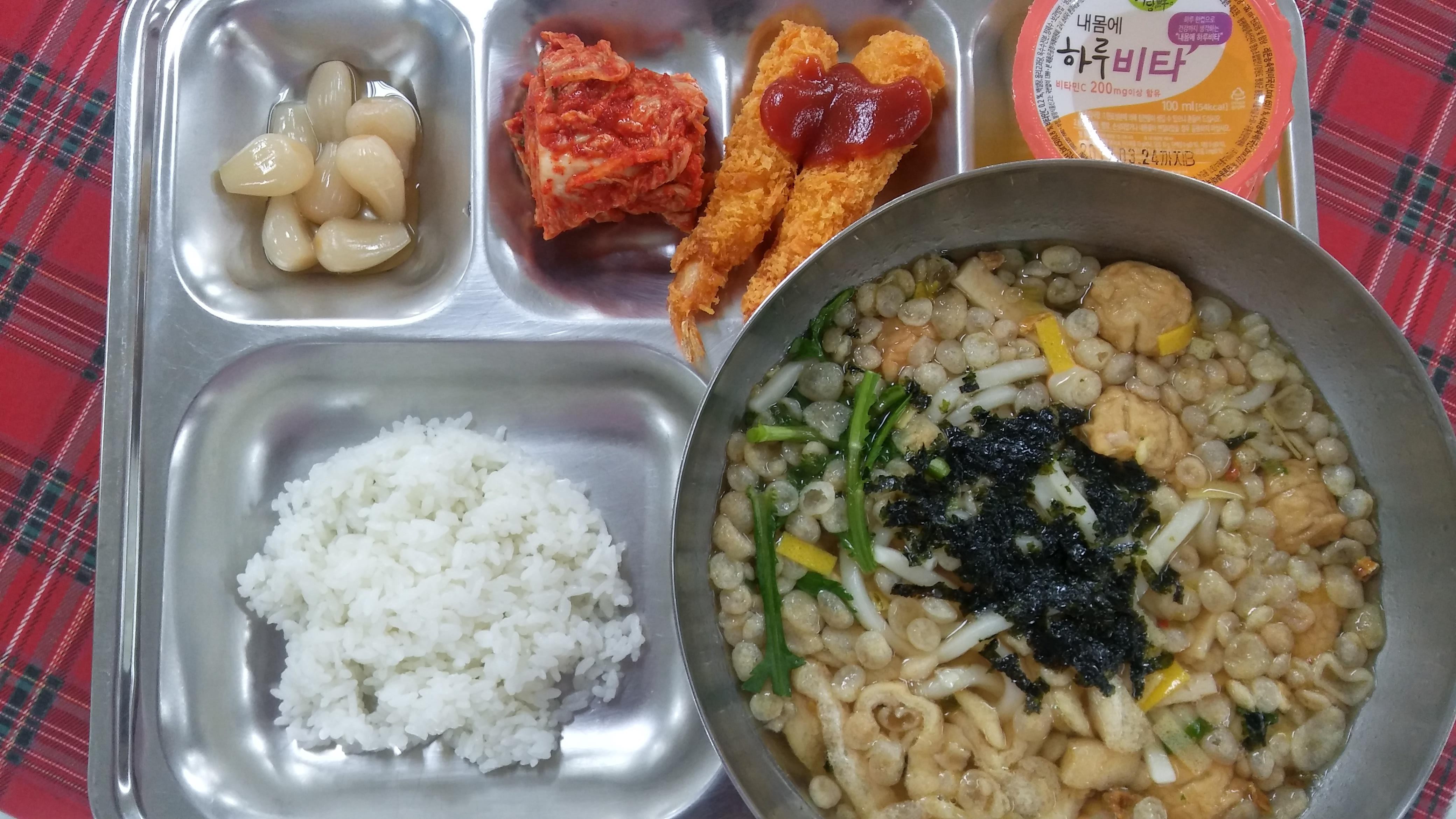 12일 중식 : 흰밥, 튀김우동, 왕새우튀김/케찹, 락교, 배추김치, 내몸에 하루비타