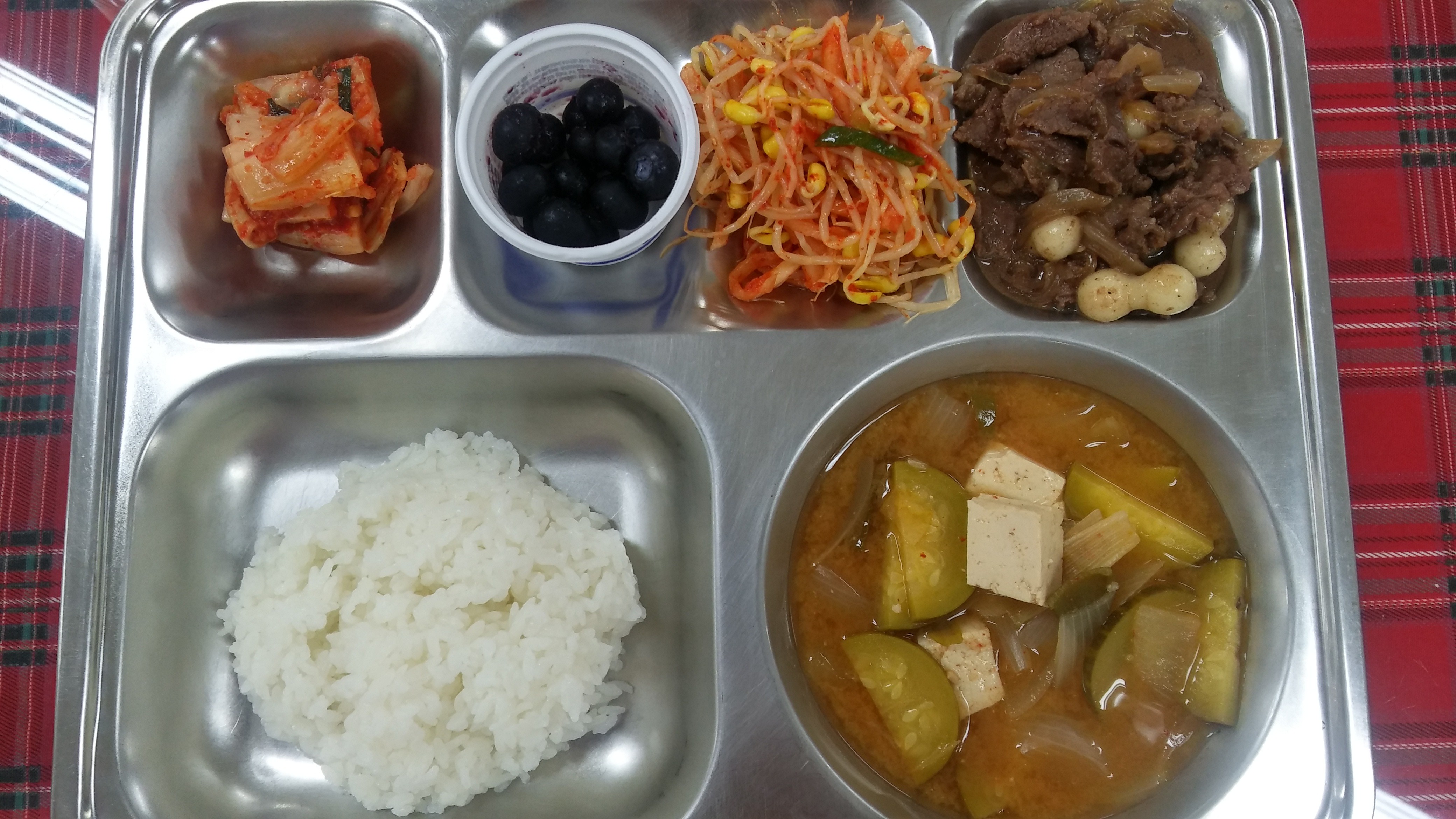 14일 : 흰밥, 소불고기, 호박두부된장국, 콩나물무생채, 배추김치, 아이스블루베리