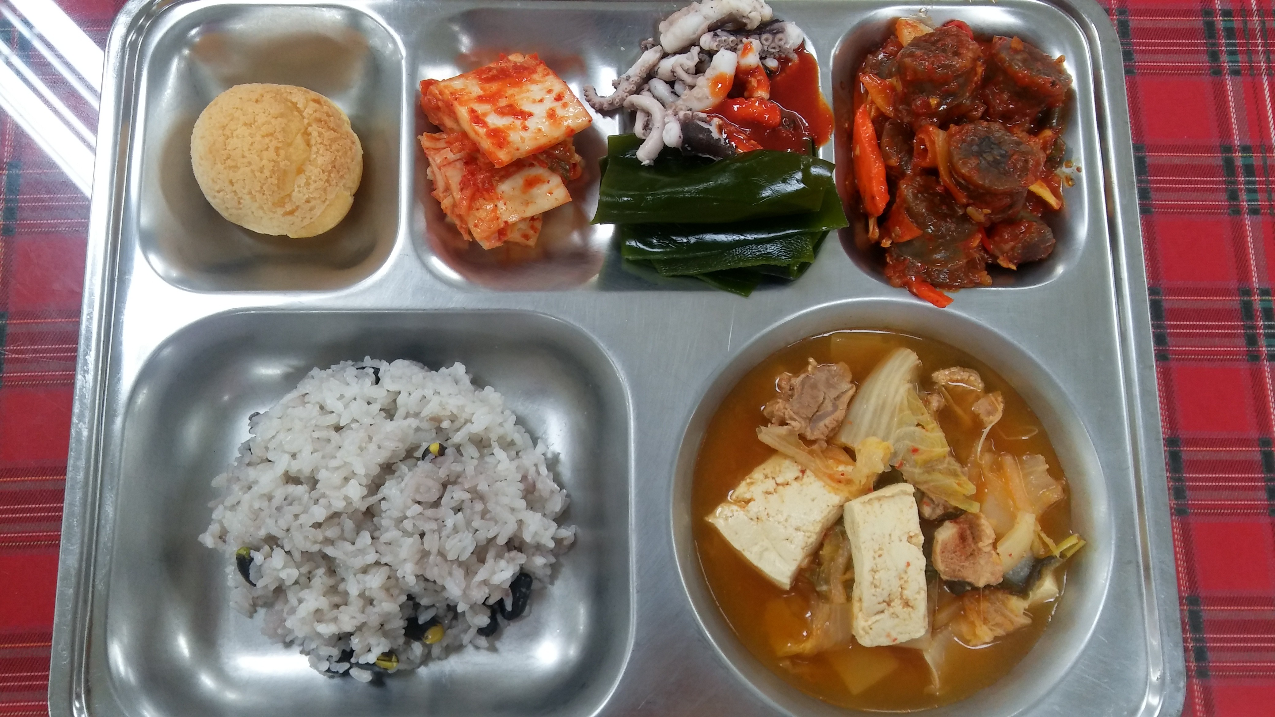 17일 중식 : 검은콩밥, 사태김치찌개, 주꾸미,다시마회/초장, 순대야채볶음, 배추김치, 생크림비스킷아이스슈