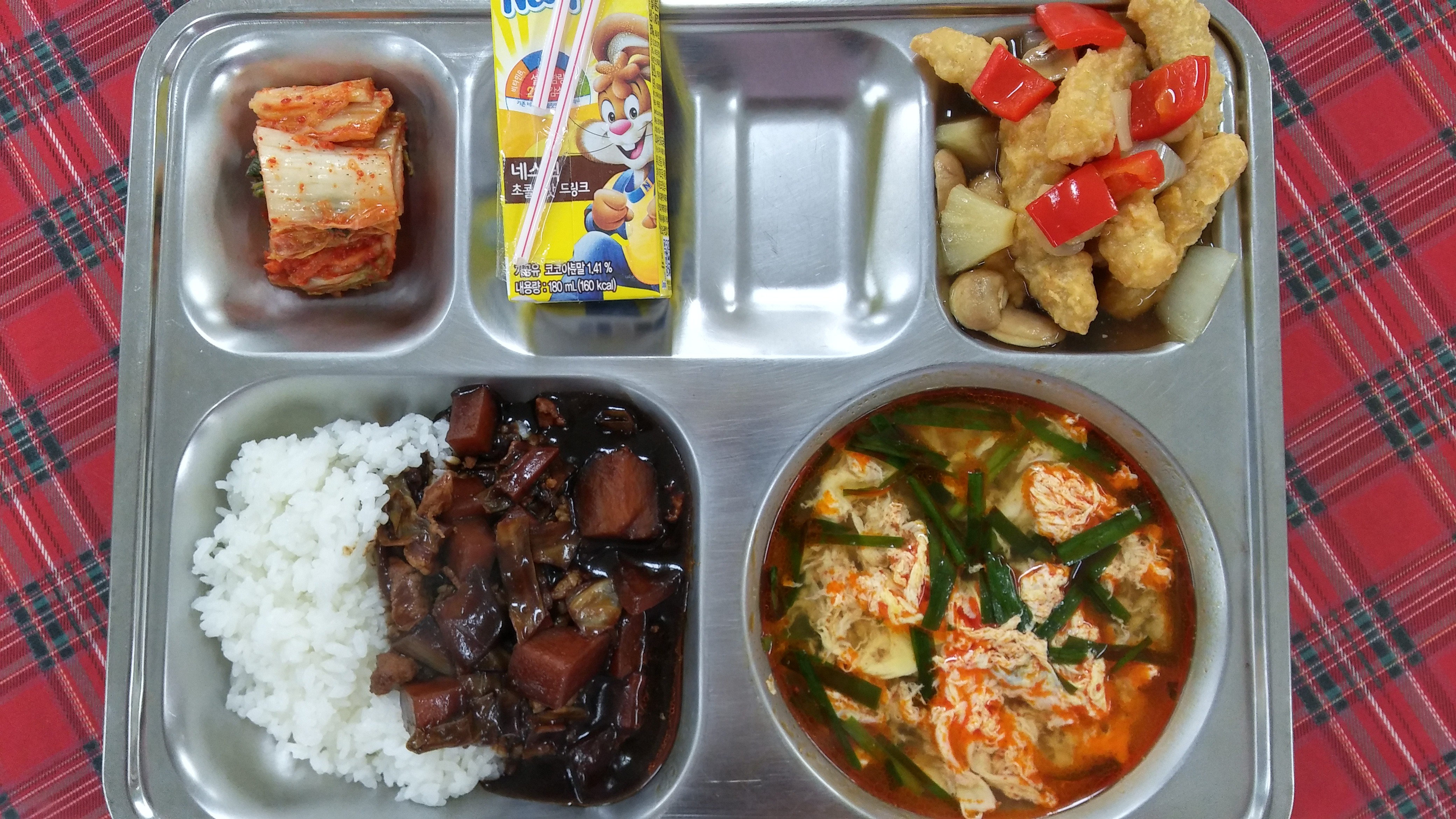 18일 중식 : 흰밥/짜장소스, 매운부추계란국, 파인애플탕수육, 배추김치, 네스퀵