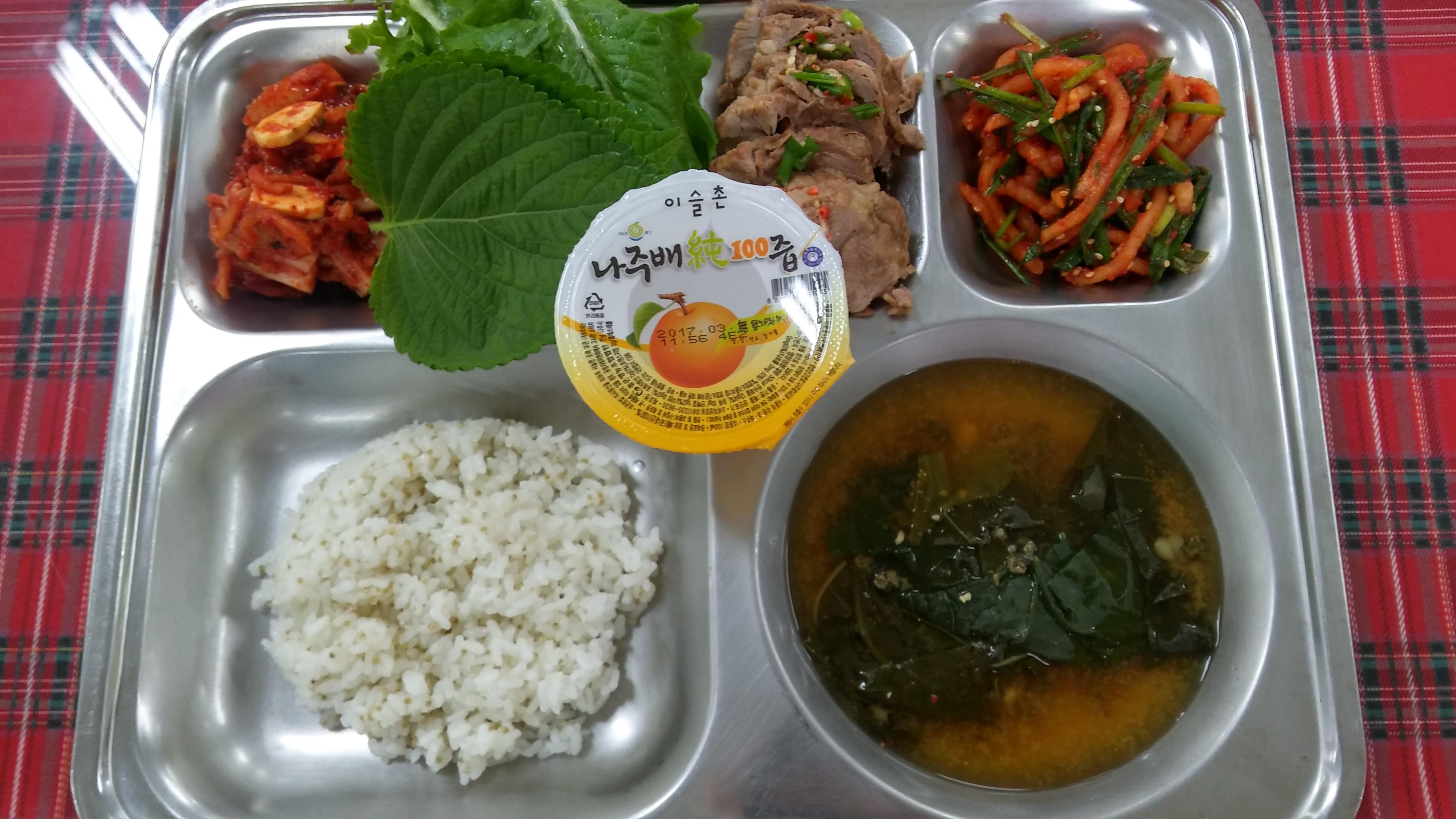 28일 중식 : 기장밥, 아욱올갱이국, 보쌈/새우젓, 부추무생채, 상추,깻잎쌈/쌈장, 보쌈김치, 나주배즙