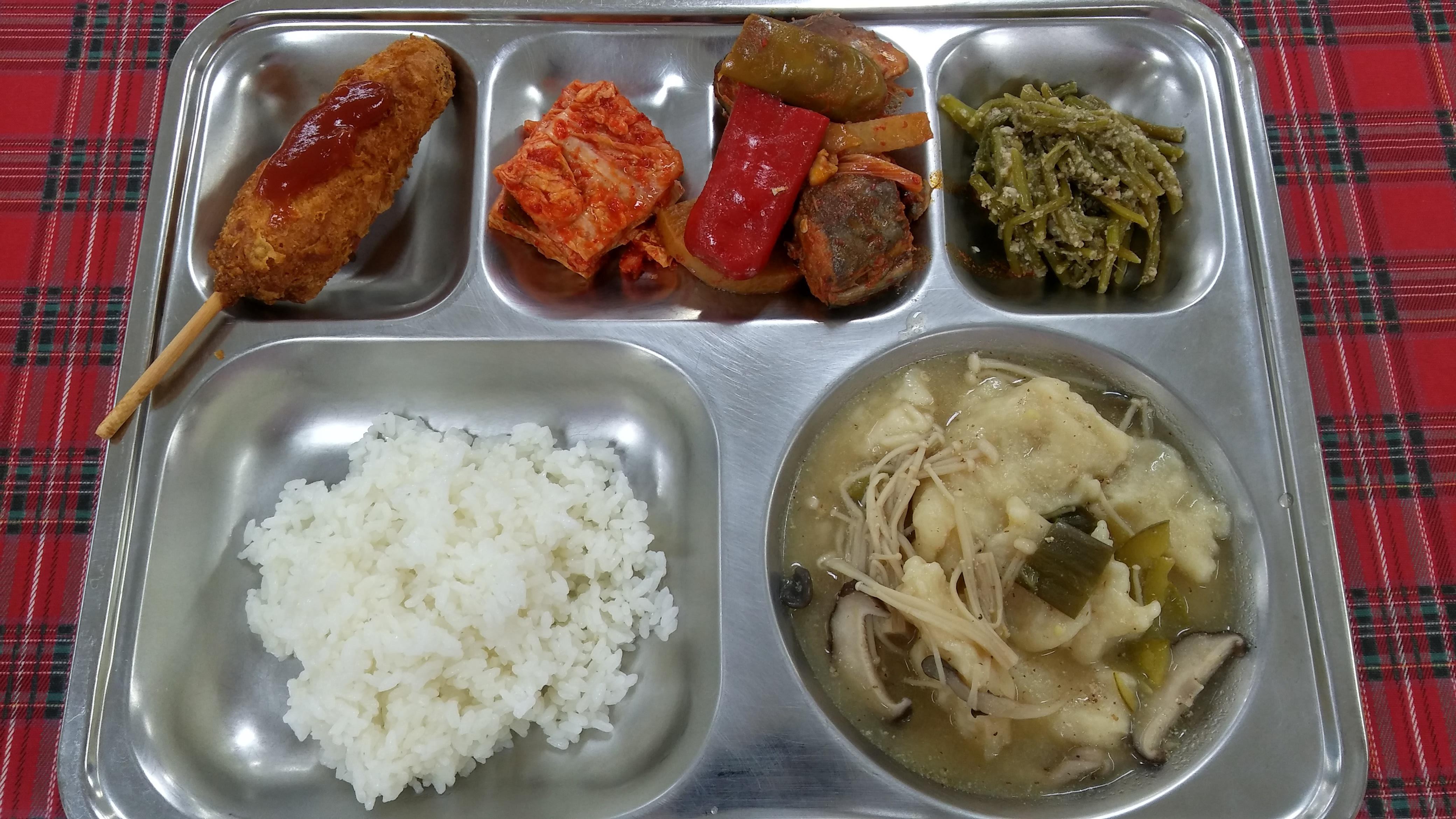 29일 중식 : 차조밥, 버섯들깨수제비, 고등어무조림, 고구마순볶음, 배추김치, 콘프레이크핫도그