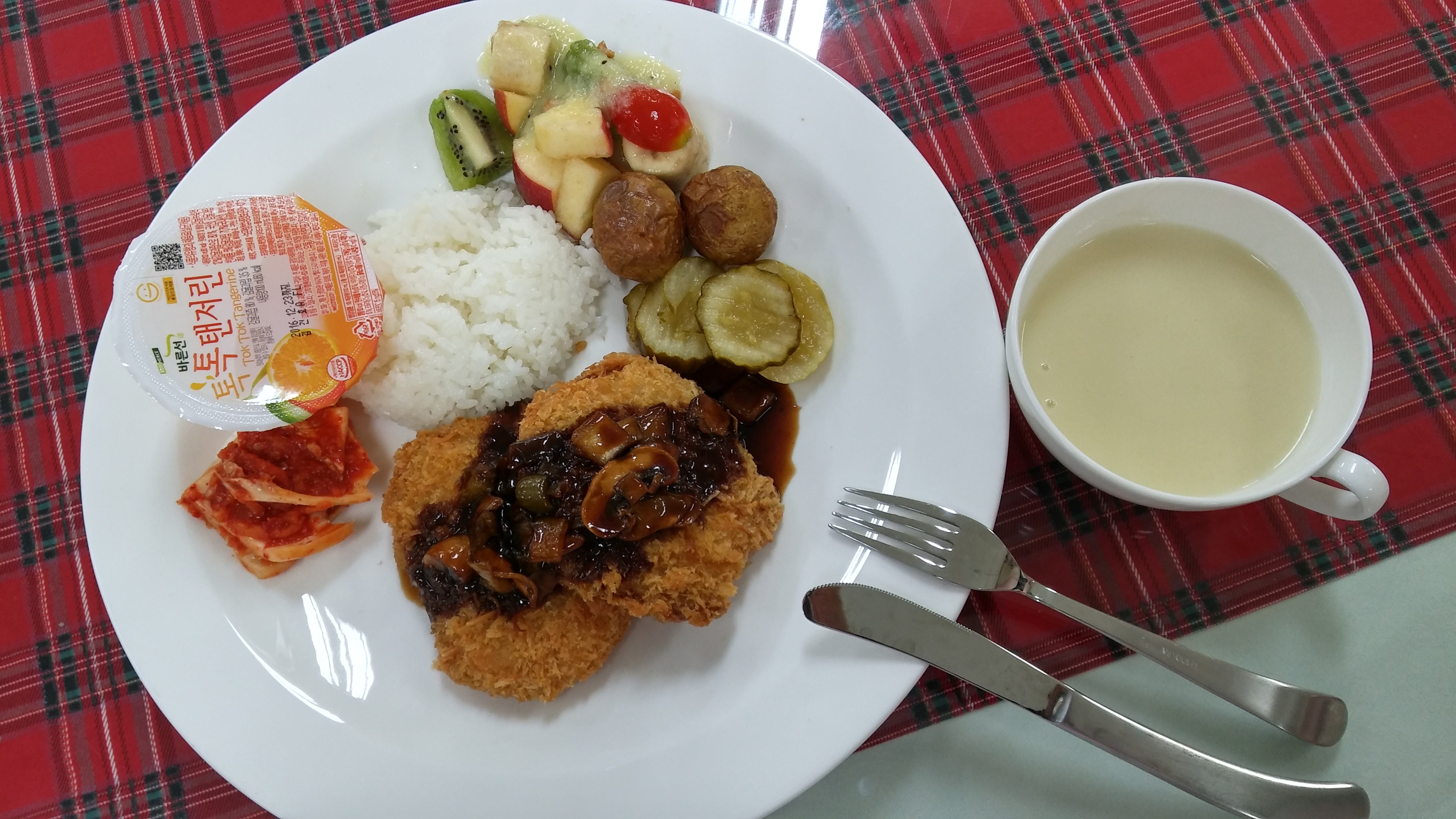 30일 중식 : 모짜렐라치즈돈까스/스테이크소스, 옥수수스프, 과일샐러드/키위소스, 알감자버터구이, 오이피클, 배추김치, 톡톡텐저린