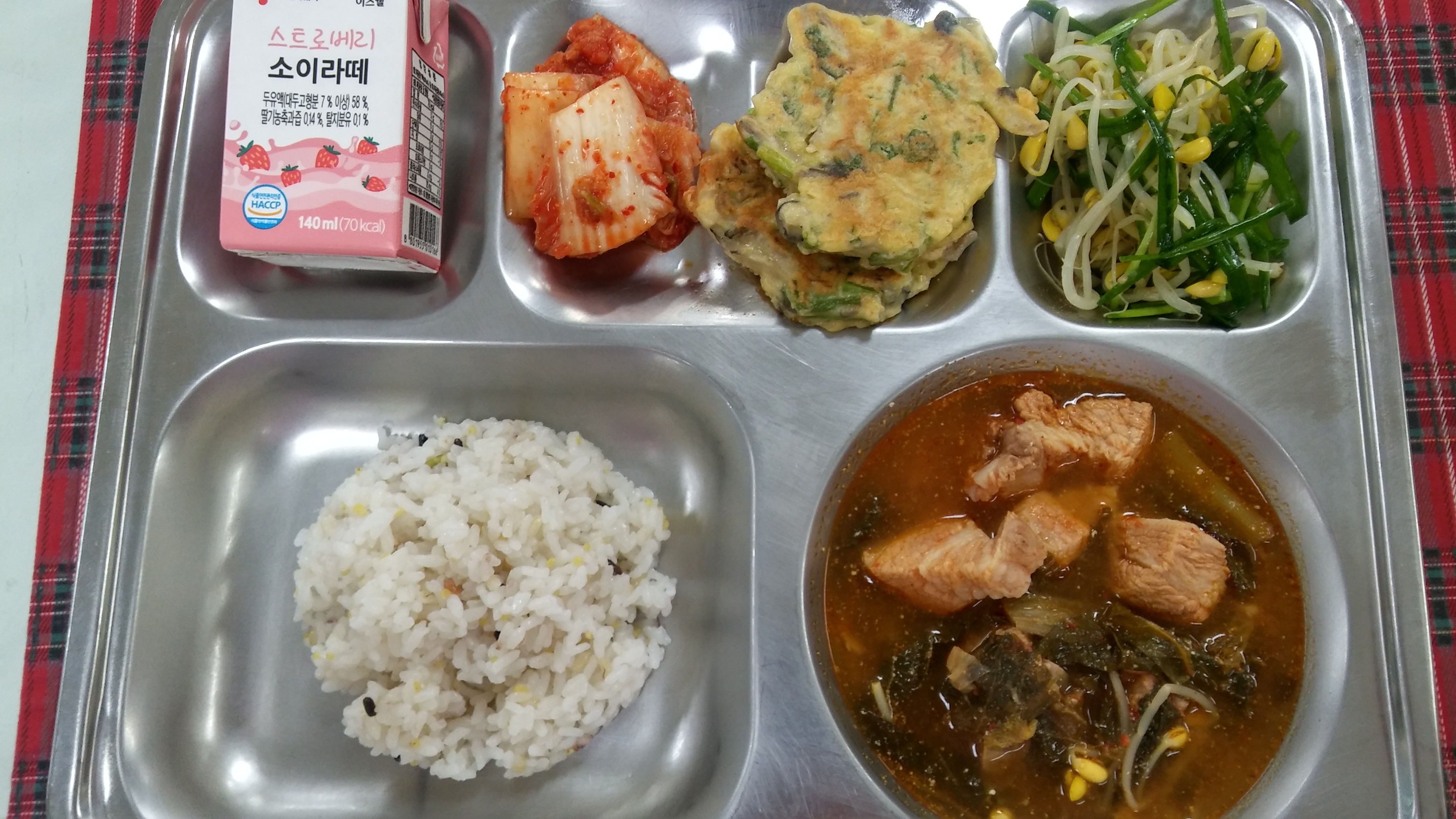 4일 중식 : 잡곡밥, 돼지갈비감자탕, 버섯야채전, 콩나물부추무침, 깍두기, 스트로베리소이라떼