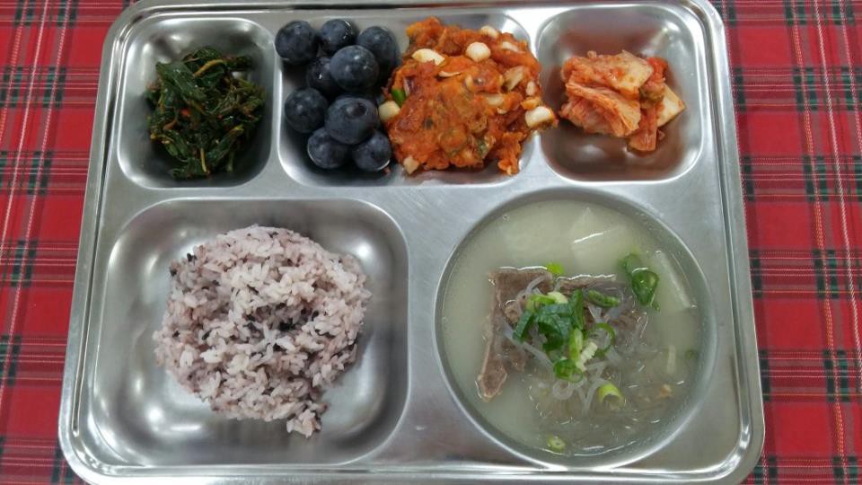 8월 29일 : 기장흑미밥, 설렁탕/당면사리, 오징어김치전, 고춧잎무침, 깍두기, 거봉