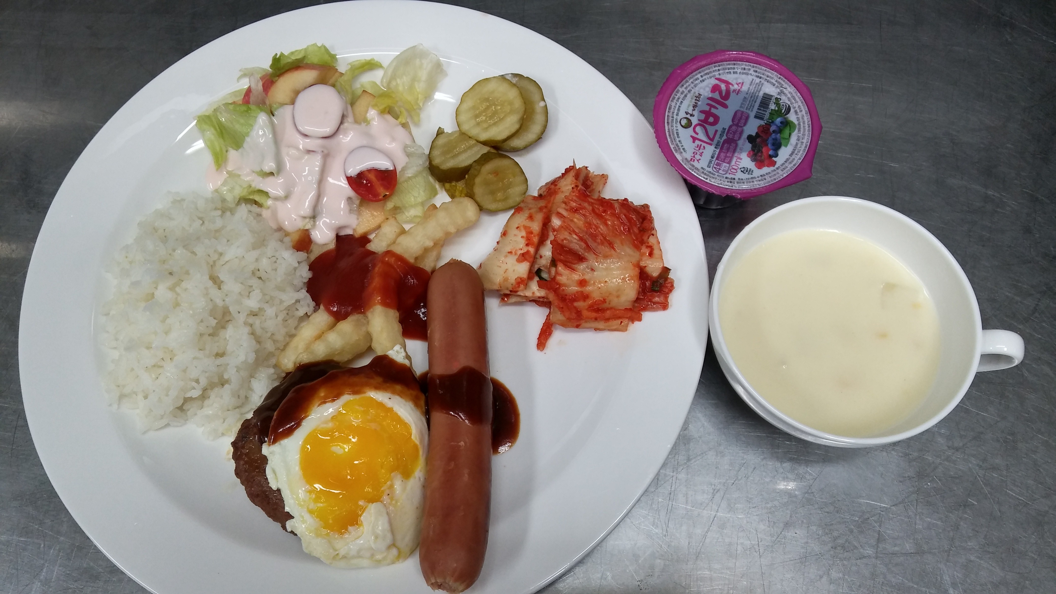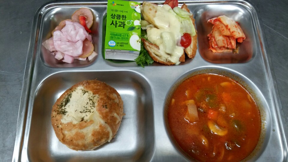 9월 1일 : 흰밥, 고메함박스테이크, 옥수수스프, 양상추사과샐러드, 감자튀김/케찹, 오이피클, 배추김치, 12베리쥬스