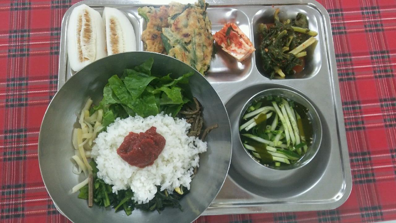 6월 16일 : 산채비빔밥, 미역오이냉국, 해물파전, 배추김치, 참외