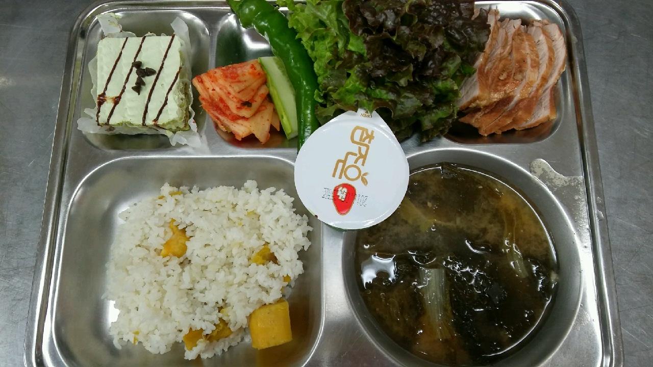 6월 17일 : 고구마밥, 배추된장국, 오향장육, 상추야채스틱/쌈장, 배추김치, 녹차조각케익, 청포도소르베
