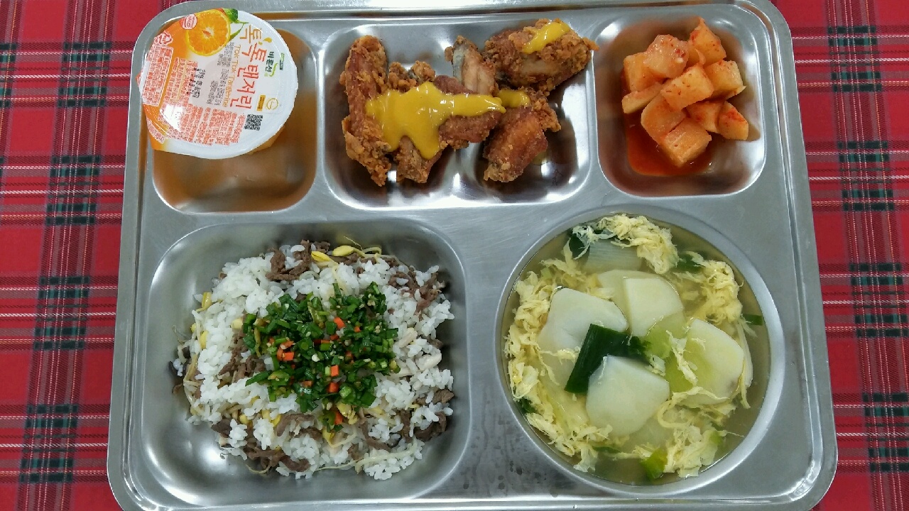 6월 14일 : 소고기콩나물밥, 감자계란국, 깍두기, 치킨윙/머스타드, 톡톡탠저린
