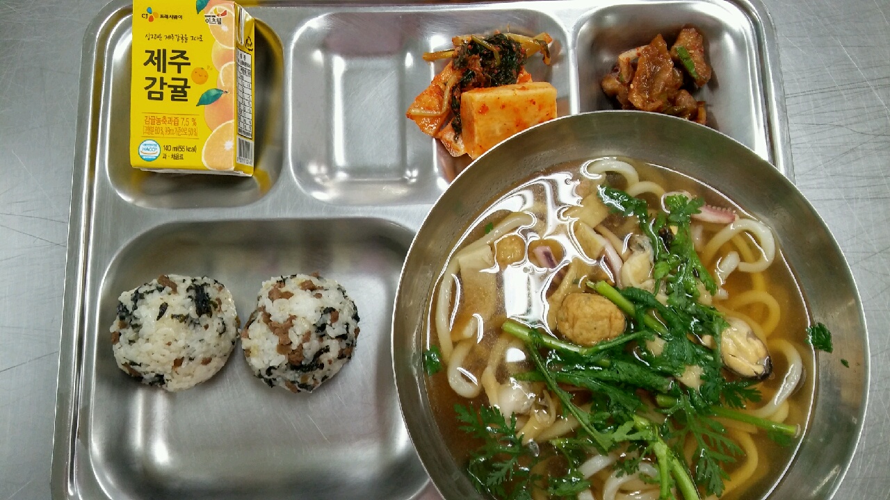29일 : 소고기주먹밥, 콩가루배추된장국, 해물우동, 오복채무침, 제주감귤쥬스