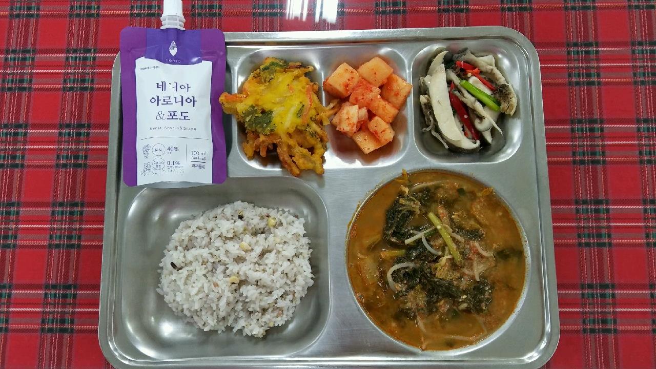 30일 : 혼합잡곡밥, 추어탕, 버섯야채볶음, 깍두기, 야채튀김, 아로니아쥬스