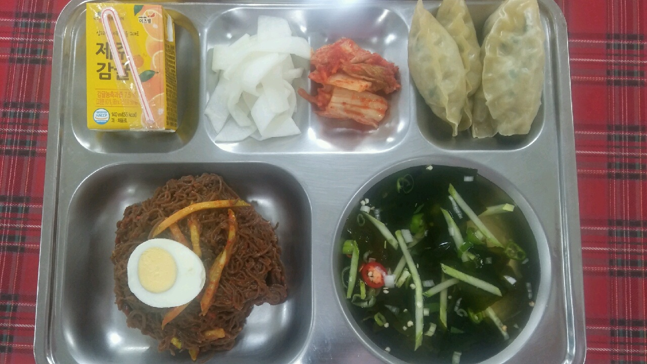 7월1일 : 비빔냉면/계란, 미역오이냉국, 무김치, 왕교자만두, 쥬스
