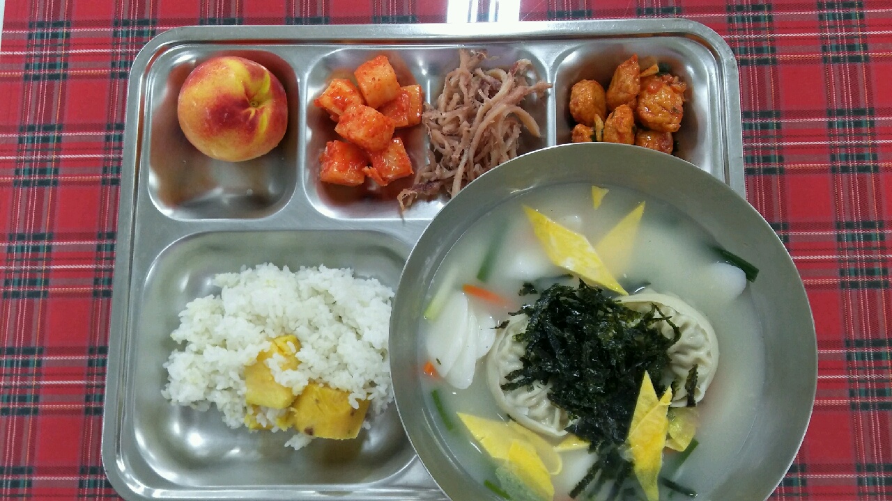 12일 : 고구마밥, 사골떡왕만두국, 완자어묵볶음, 진미채무침, 깍두기, 천도복숭아