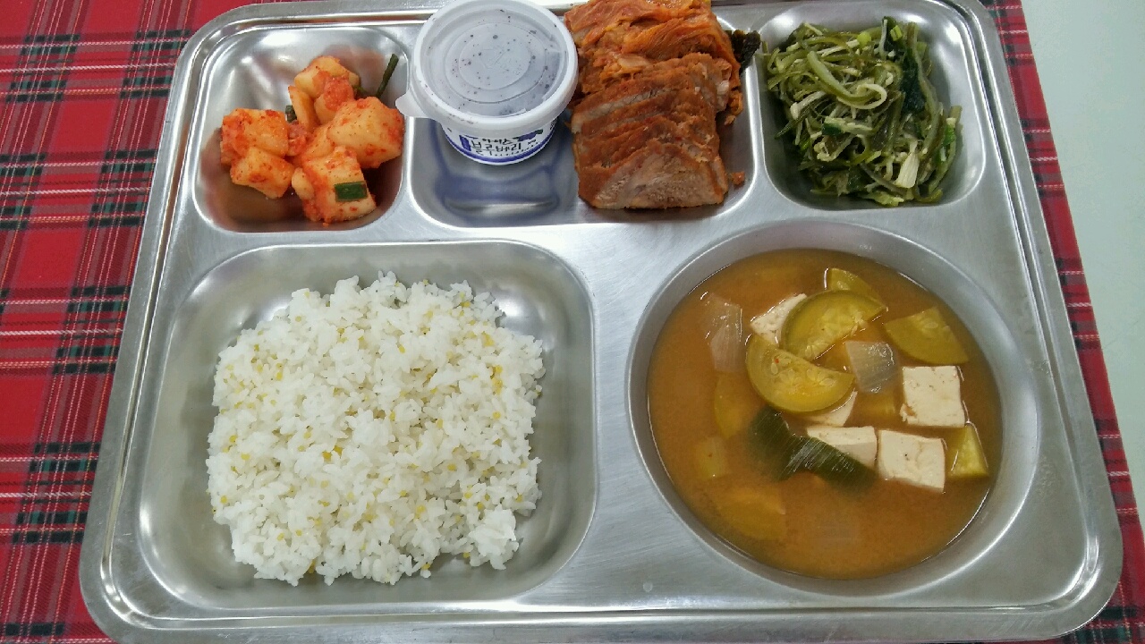 11일 : 기장밥, 호박두부된장국, 사태김치찜, 미역줄기팽이볶음, 깍두기, 아이스블루베리