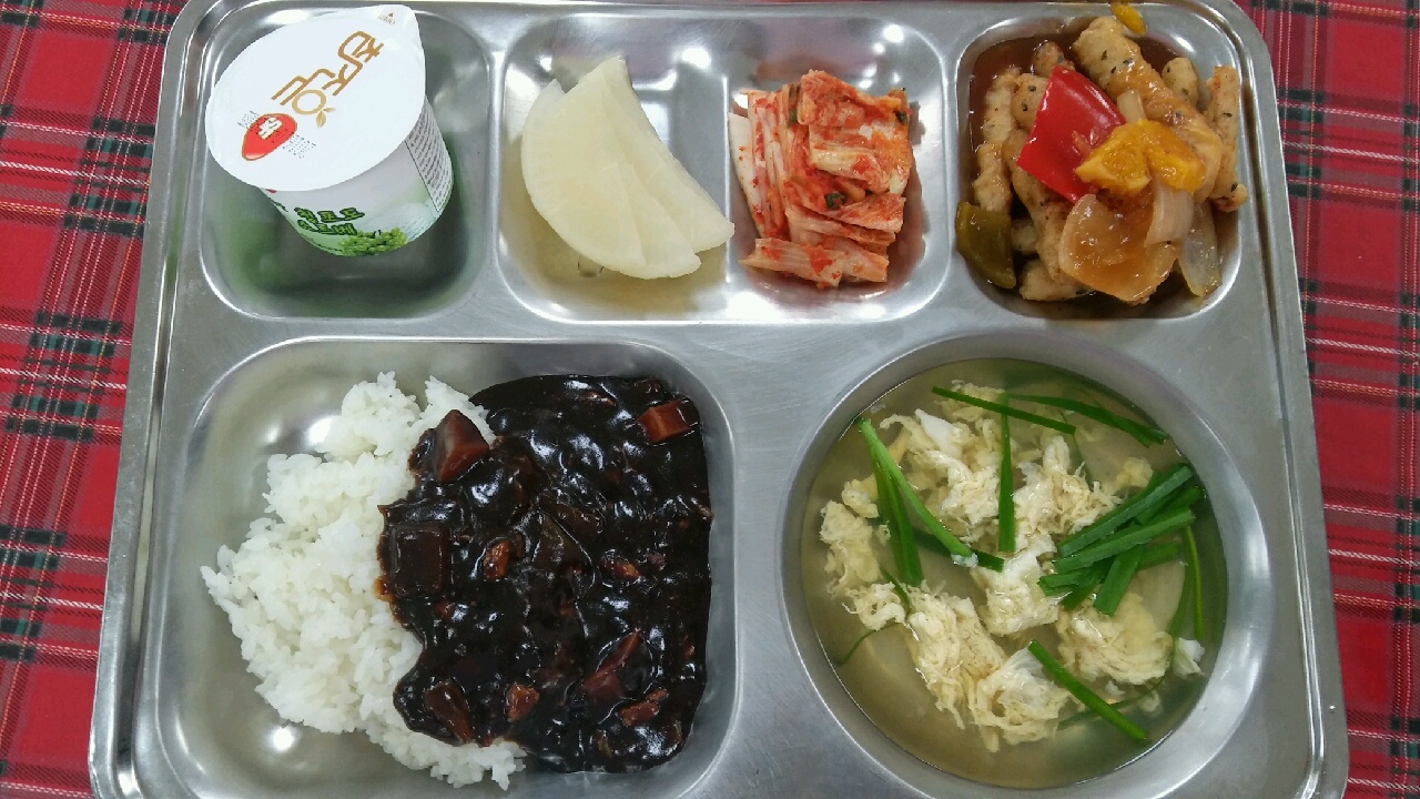 26일 : 흰밥/짜장소스, 오렌지탕수육, 부추계란국, 백색단무지, 배추김치, 청포도소르베